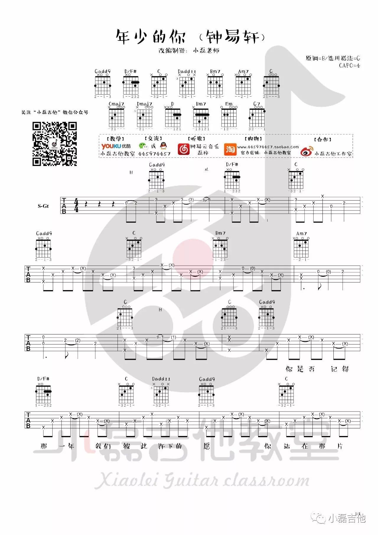 曲谱介绍: 钟易轩《年少的你》吉他弹唱谱,采用G调指法编配,共有4张高清图谱。