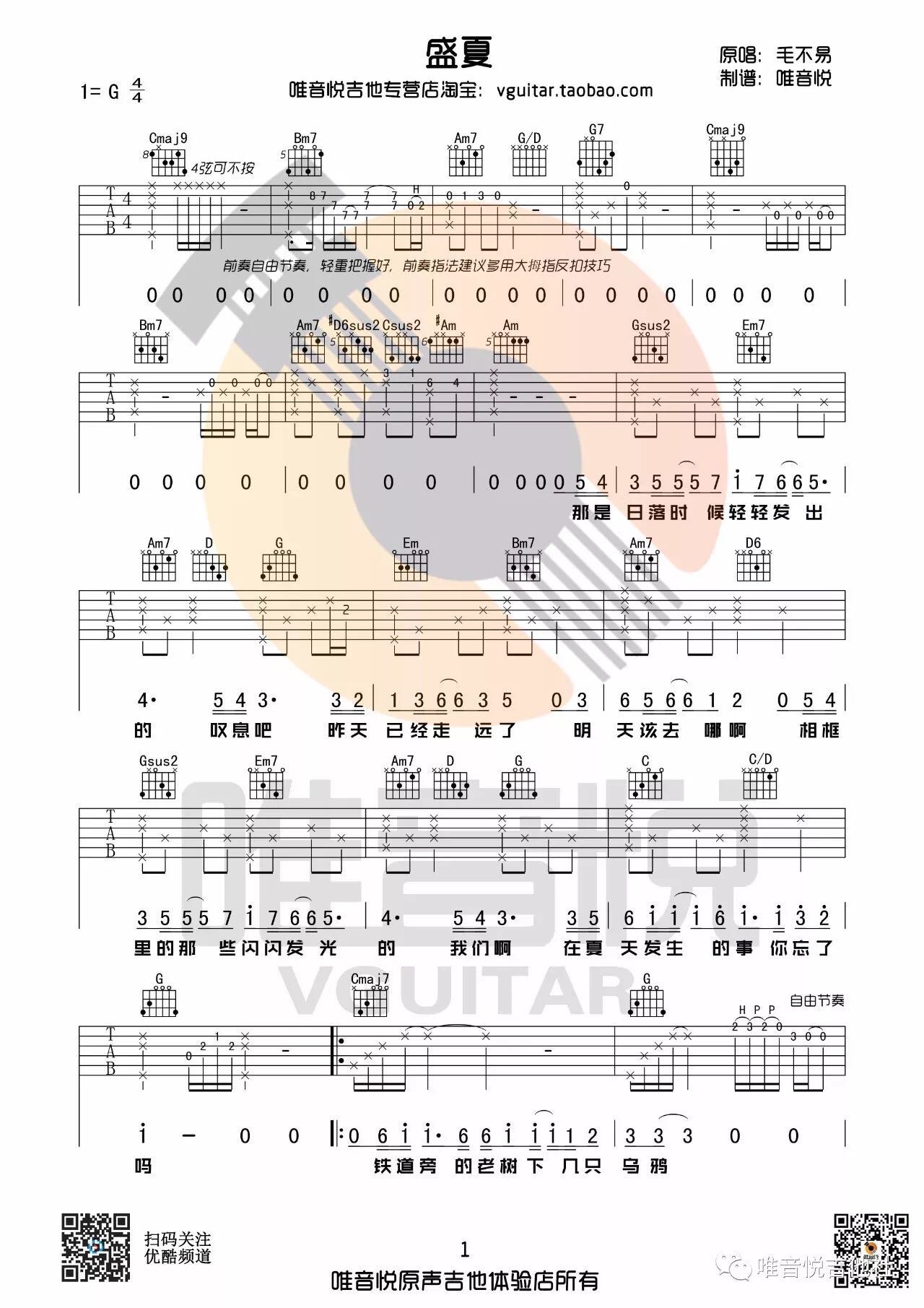 曲谱介绍: 毛不易《盛夏》吉他弹唱谱,采用G调指法编配,共有3张高清图谱。
