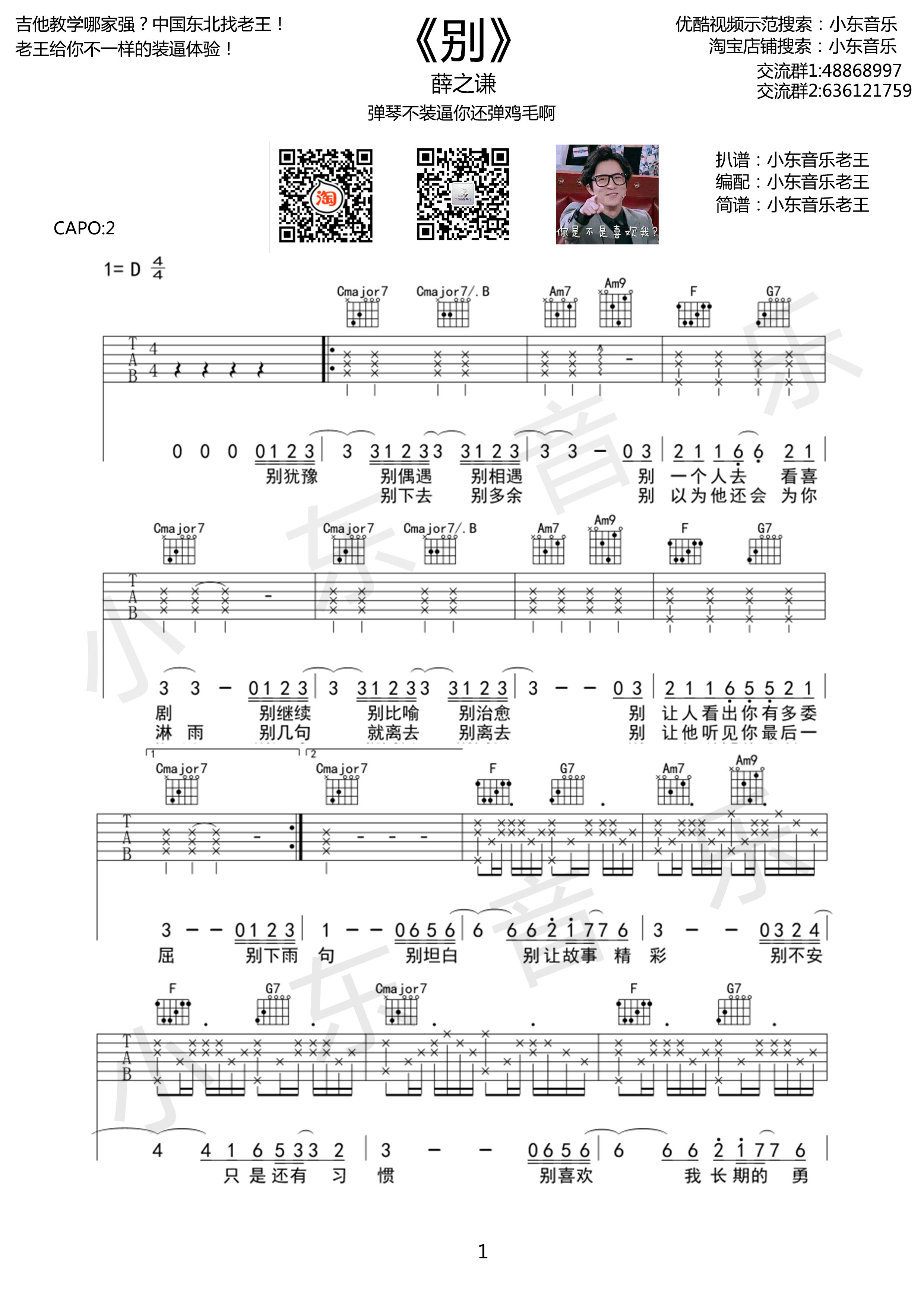 曲谱介绍: 薛之谦《别》吉他弹唱谱,采用D调指法编配,共有3张高清图谱。