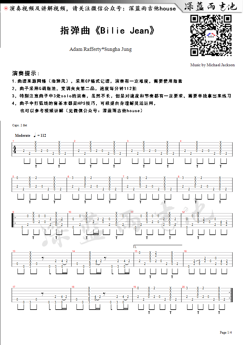 曲谱介绍: Michael,Jackson《BilieJean》吉他独奏谱,采用G调指法编配,共有4张高清图谱。
