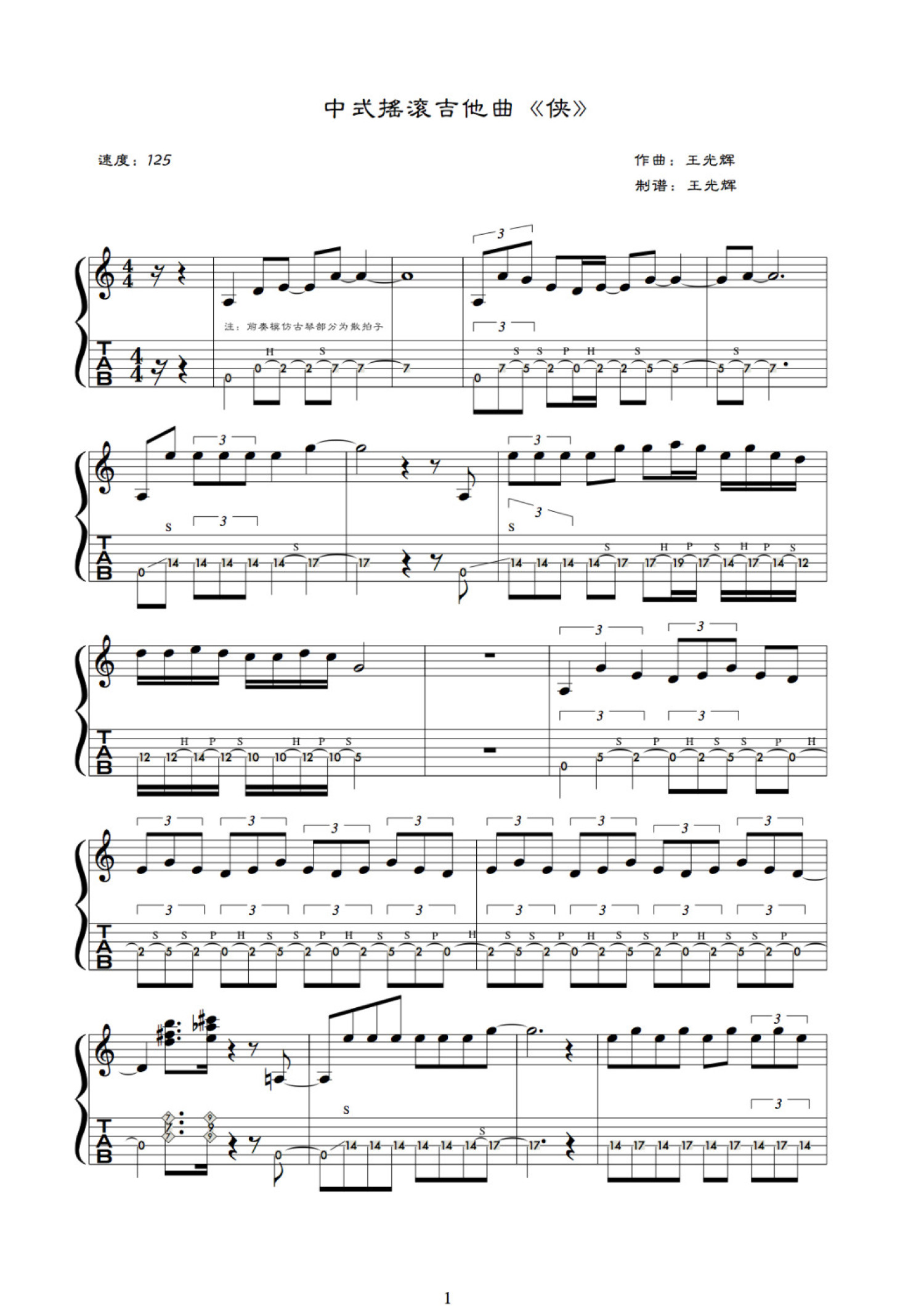曲谱介绍: 王光辉《侠》吉他谱_电吉他谱