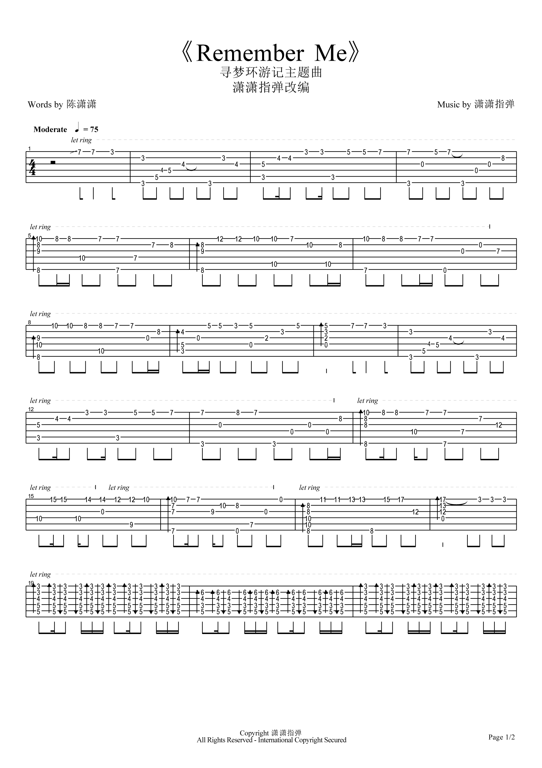 Remember Me 潇潇吉他谱 - 游戏动漫 - 吉他独奏谱