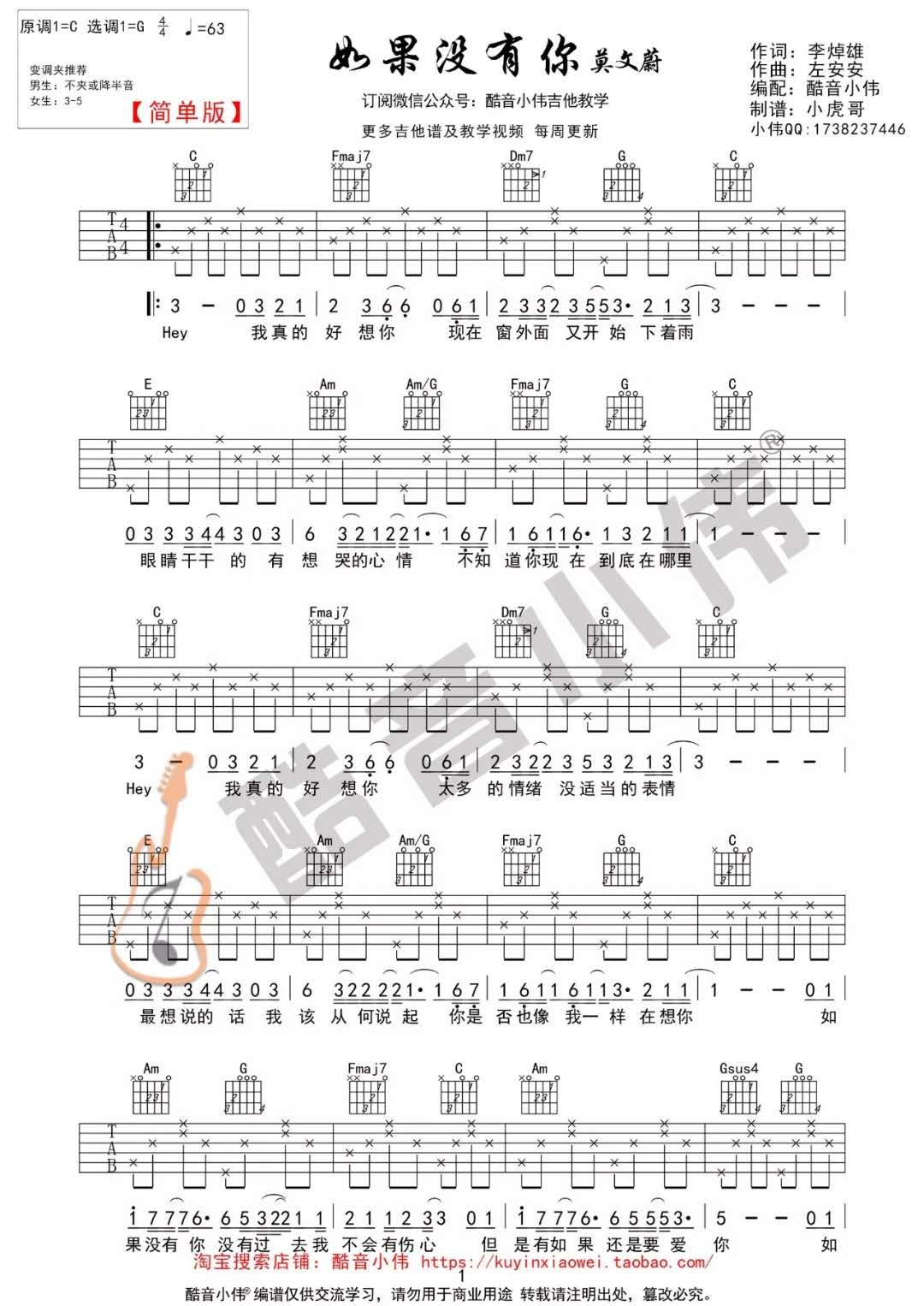 曲谱介绍: 莫文蔚《如果没有你简单版》吉他弹唱谱,采用G调指法编配,共有2张高清图谱,免翻页排版设计。