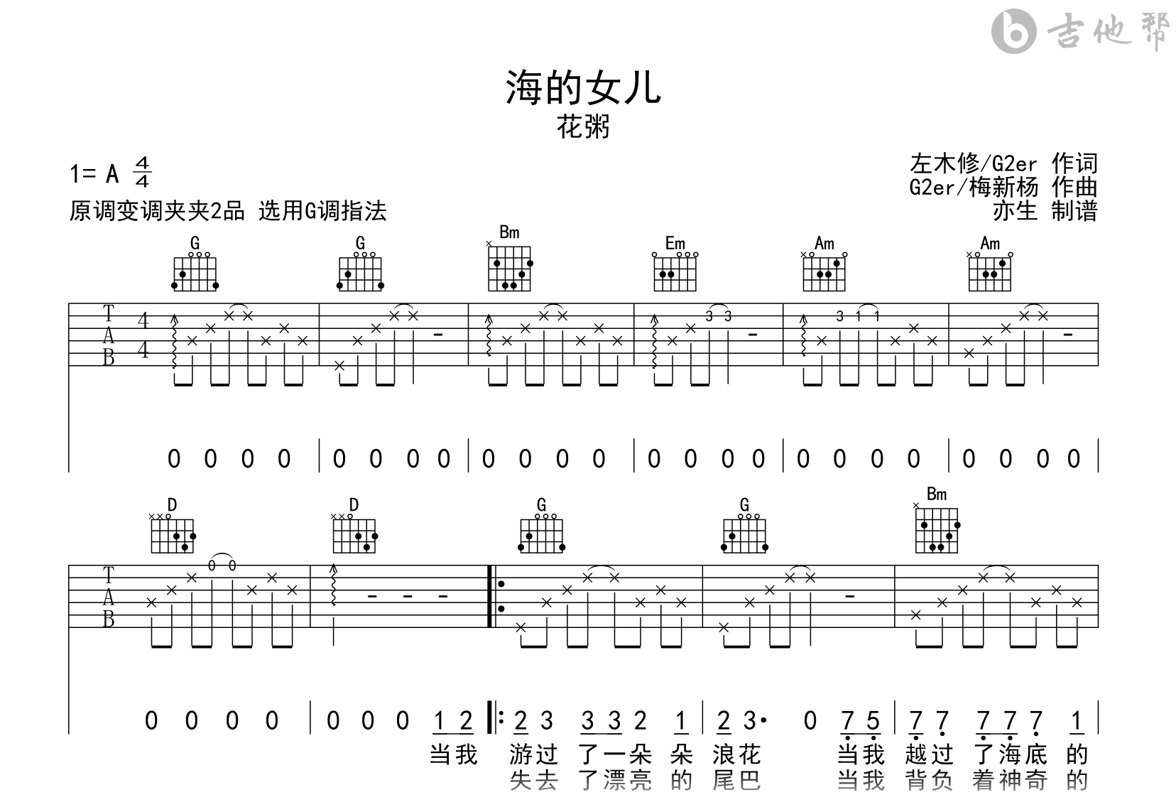 曲谱介绍: 海的女儿吉他谱,花粥的一首新歌,将人们熟悉的寓言故事以新的角度娓娓道来,为爱放弃自由的人,将一生困于初见。在歌声里,我们会听见:总有些人会为一次心动而献上一切。 《海的女儿》吉他弹唱谱,原调A,选用G调和弦指法编配,变调夹夹2品,节奏4/4拍,速度大概每分钟95拍,演奏整体难度简单。