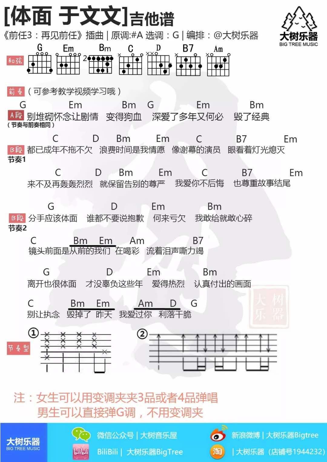 曲谱介绍: 于文文《体面》吉他弹唱谱,采用G调指法编配,共有1张高清图谱,免翻页排版设计。
