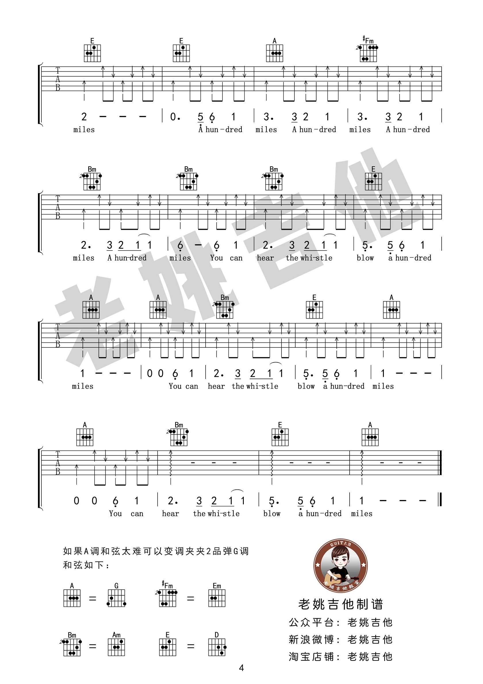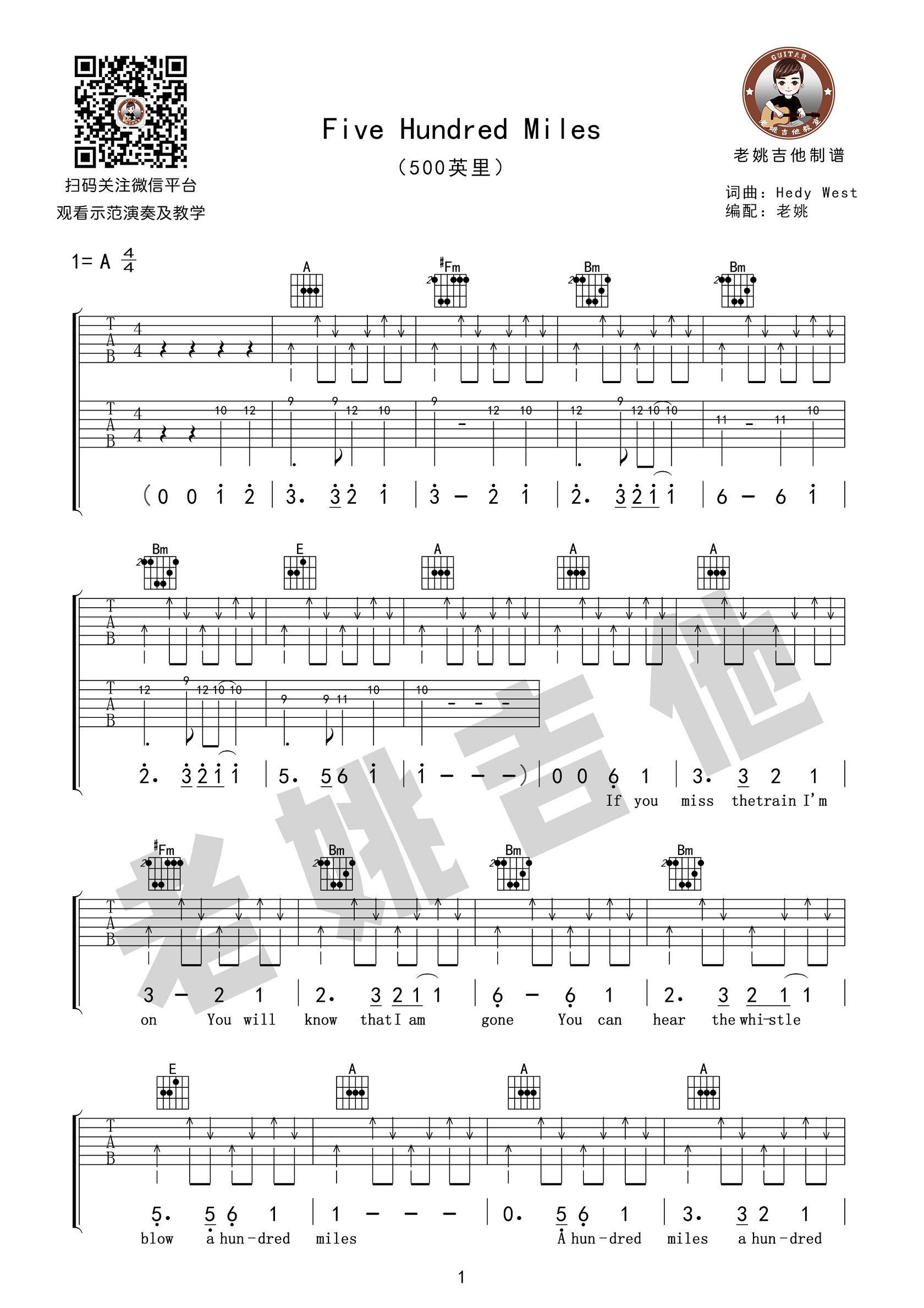曲谱介绍: Justin,Timberlake《FiveHundredMiles》吉他弹唱谱,采用A调指法编配,共有4张高清图谱。