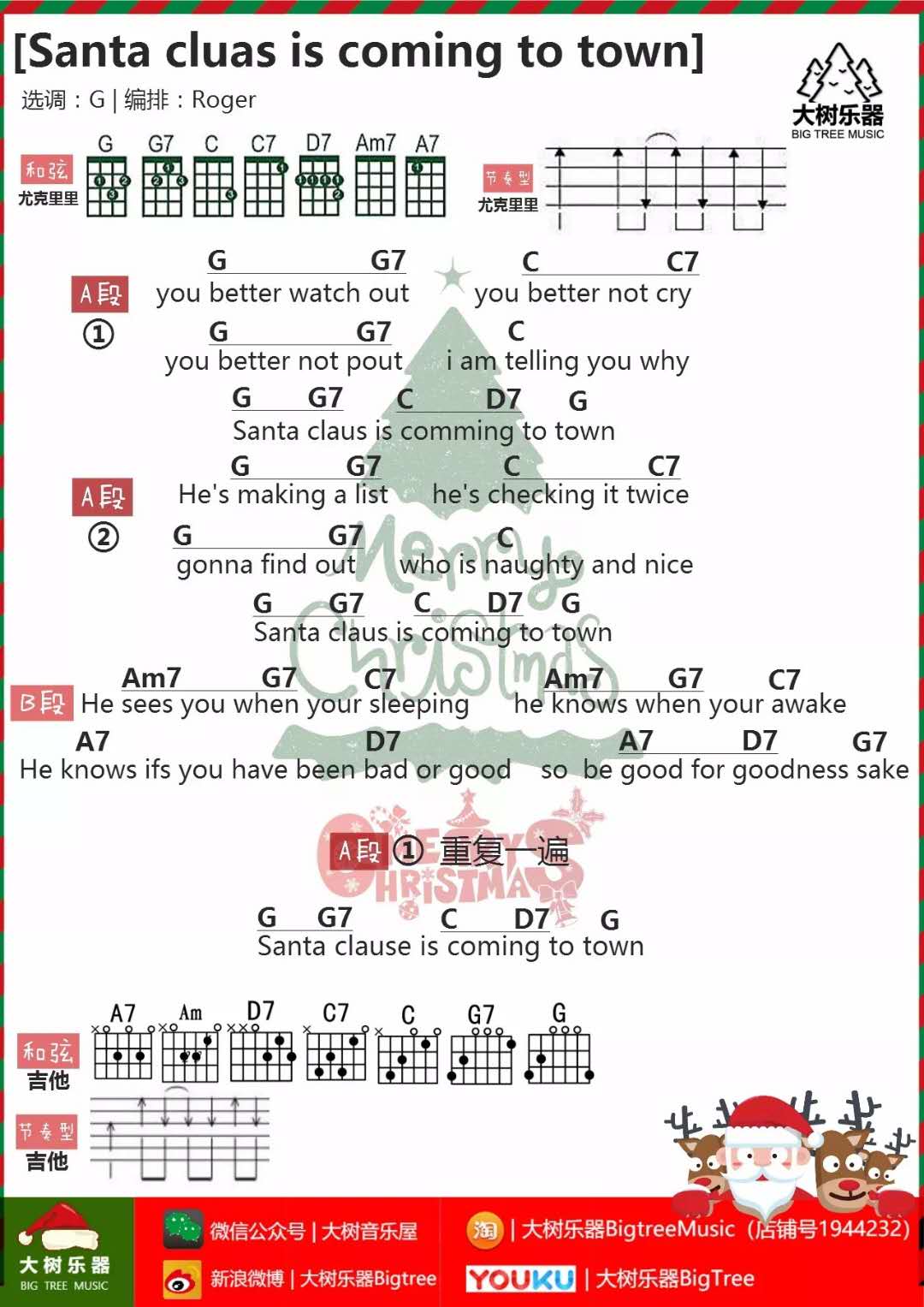 曲谱介绍: 圣诞歌曲《Santacluasisconmingtotown》吉他弹唱谱,采用G调指法编配,共有1张高清图谱,免翻页排版设计。