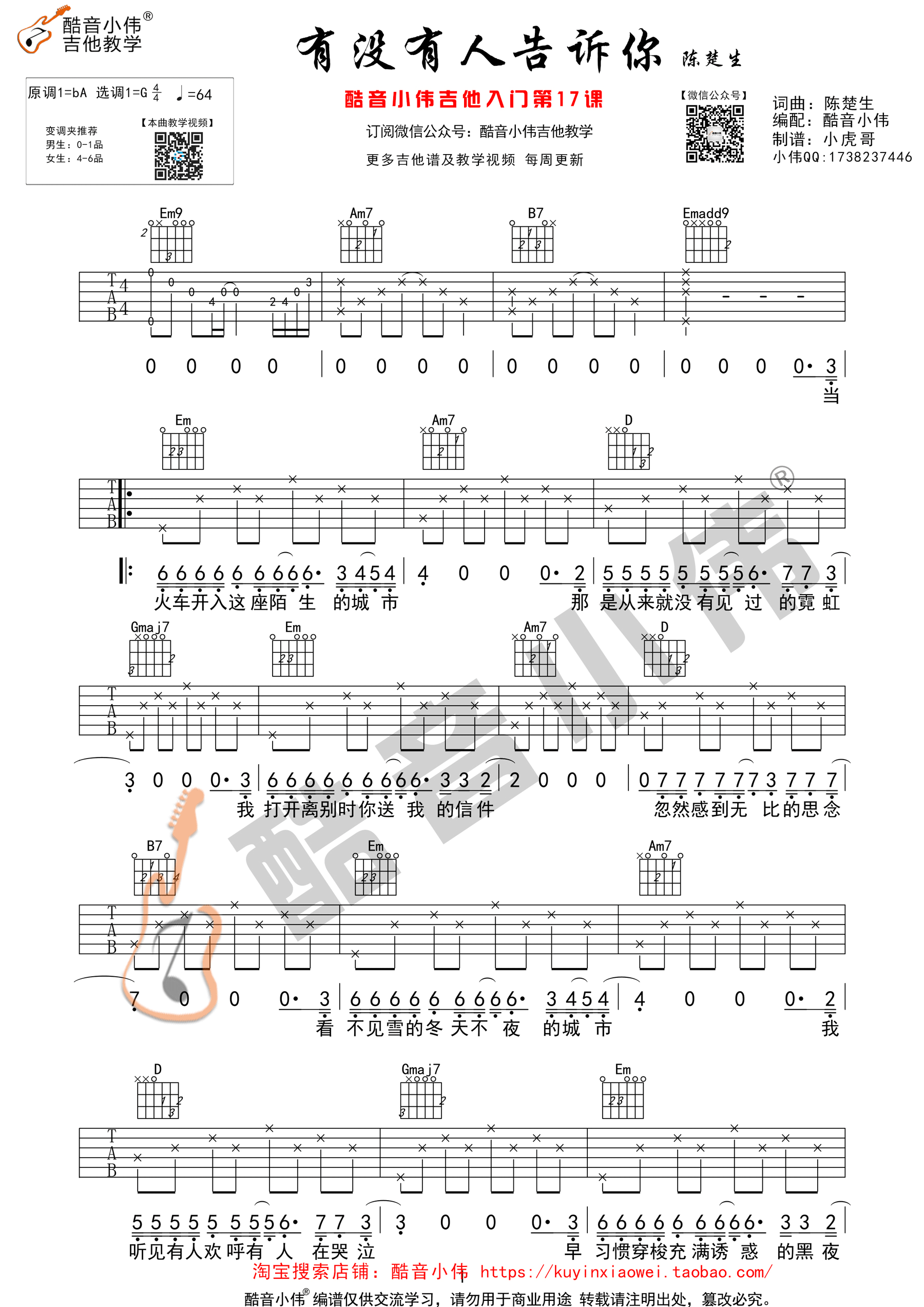 曲谱介绍: 陈楚生《有没有人告诉你》吉他弹唱谱,采用G调指法编配,共有2张高清图谱,免翻页排版设计。