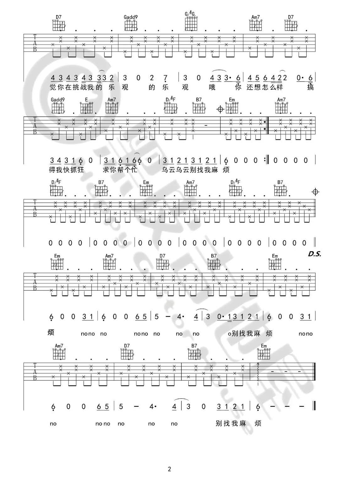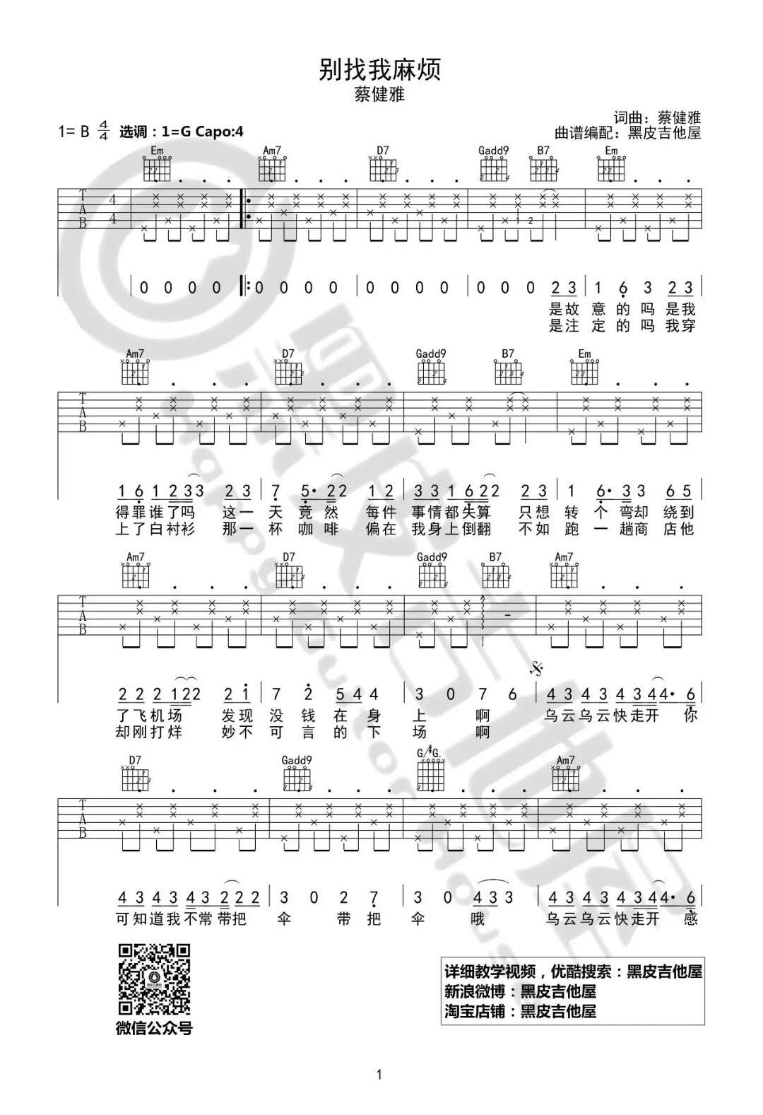 曲谱介绍: 蔡健雅《别找我麻烦》吉他弹唱谱,采用G调指法编配,共有2张高清图谱,免翻页排版设计。