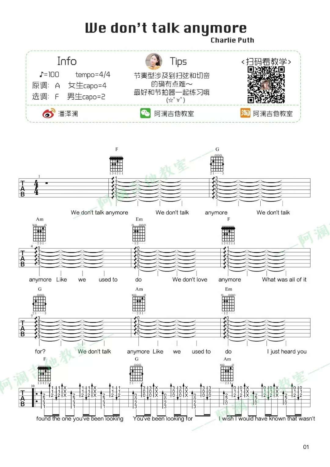 We Dont Talk Anymore吉他谱 - Charlie,Puth,Selena,Gomez - F调吉他弹唱谱