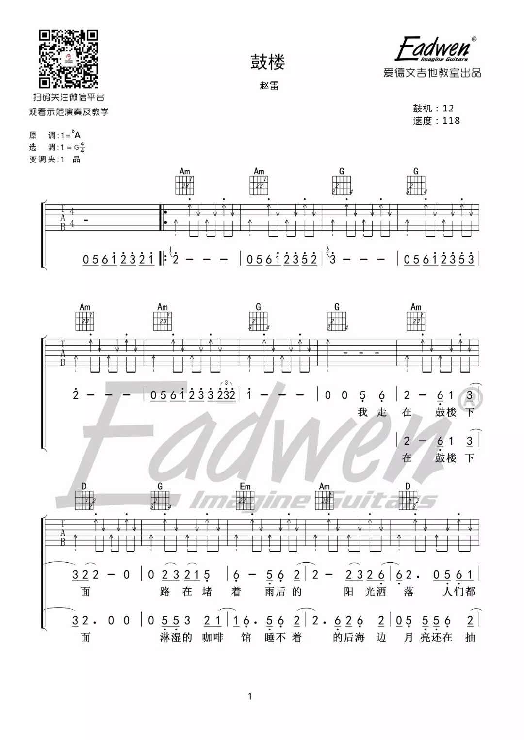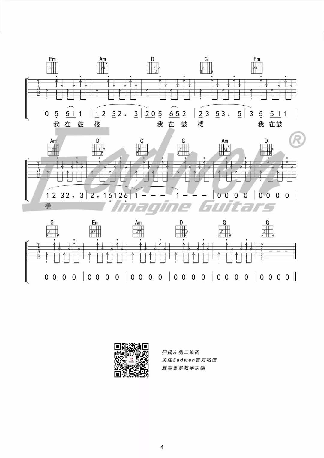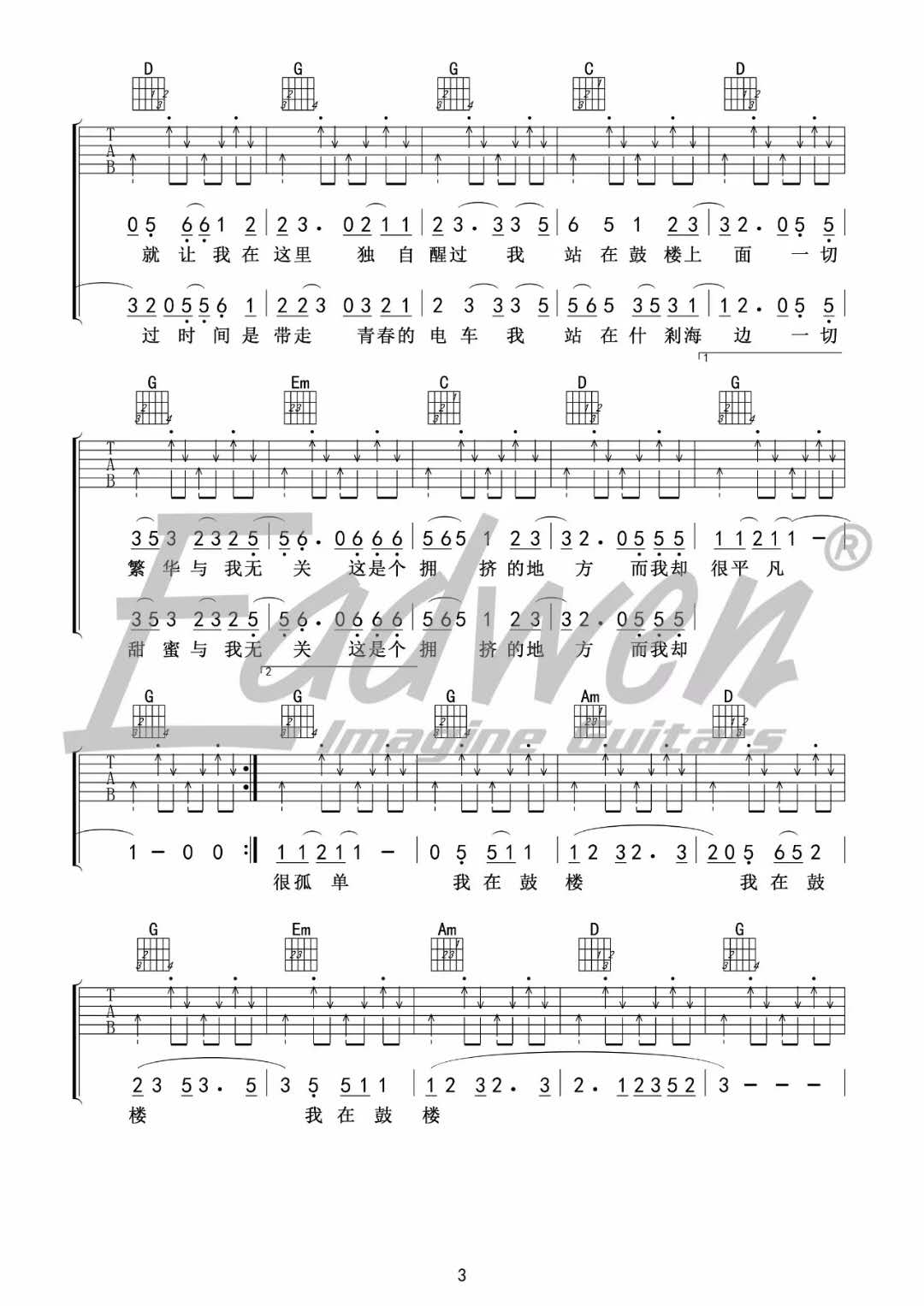 曲谱介绍: 赵雷《鼓楼》吉他弹唱谱,采用G调指法编配,共有4张高清图谱。
