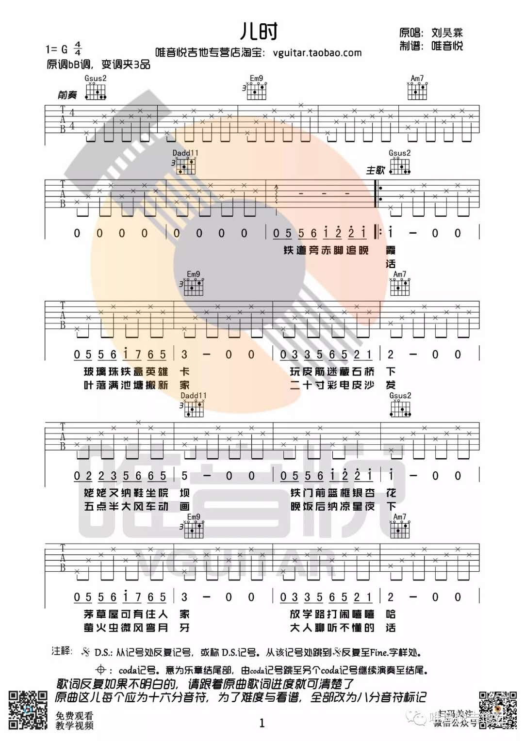 曲谱介绍: 刘昊霖《儿时》吉他弹唱谱,采用G调指法编配,共有3张高清图谱。