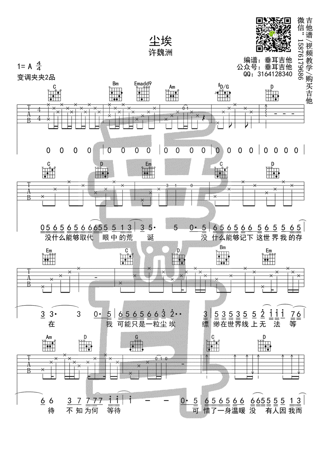 曲谱介绍: 许魏洲《尘埃》吉他弹唱谱,采用A调指法编配,共有2张高清图谱,免翻页排版设计。