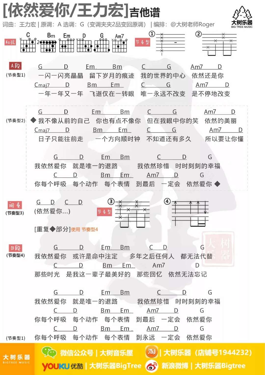 曲谱介绍: 王力宏《依然爱你》吉他弹唱谱,采用G调指法编配,共有1张高清图谱,免翻页排版设计。
