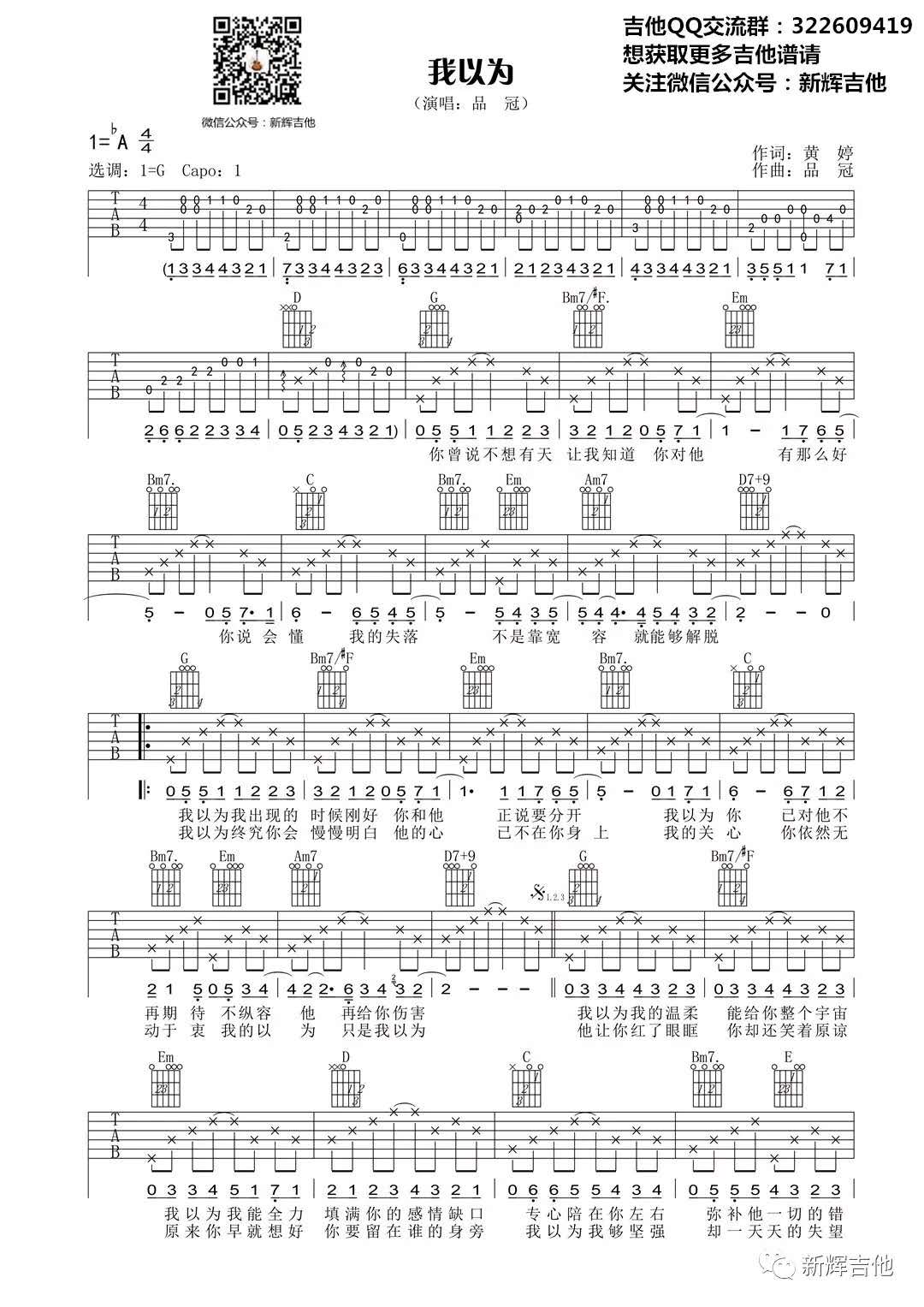曲谱介绍: 品冠《我以为》吉他弹唱谱,采用A调指法编配,共有2张高清图谱,免翻页排版设计。