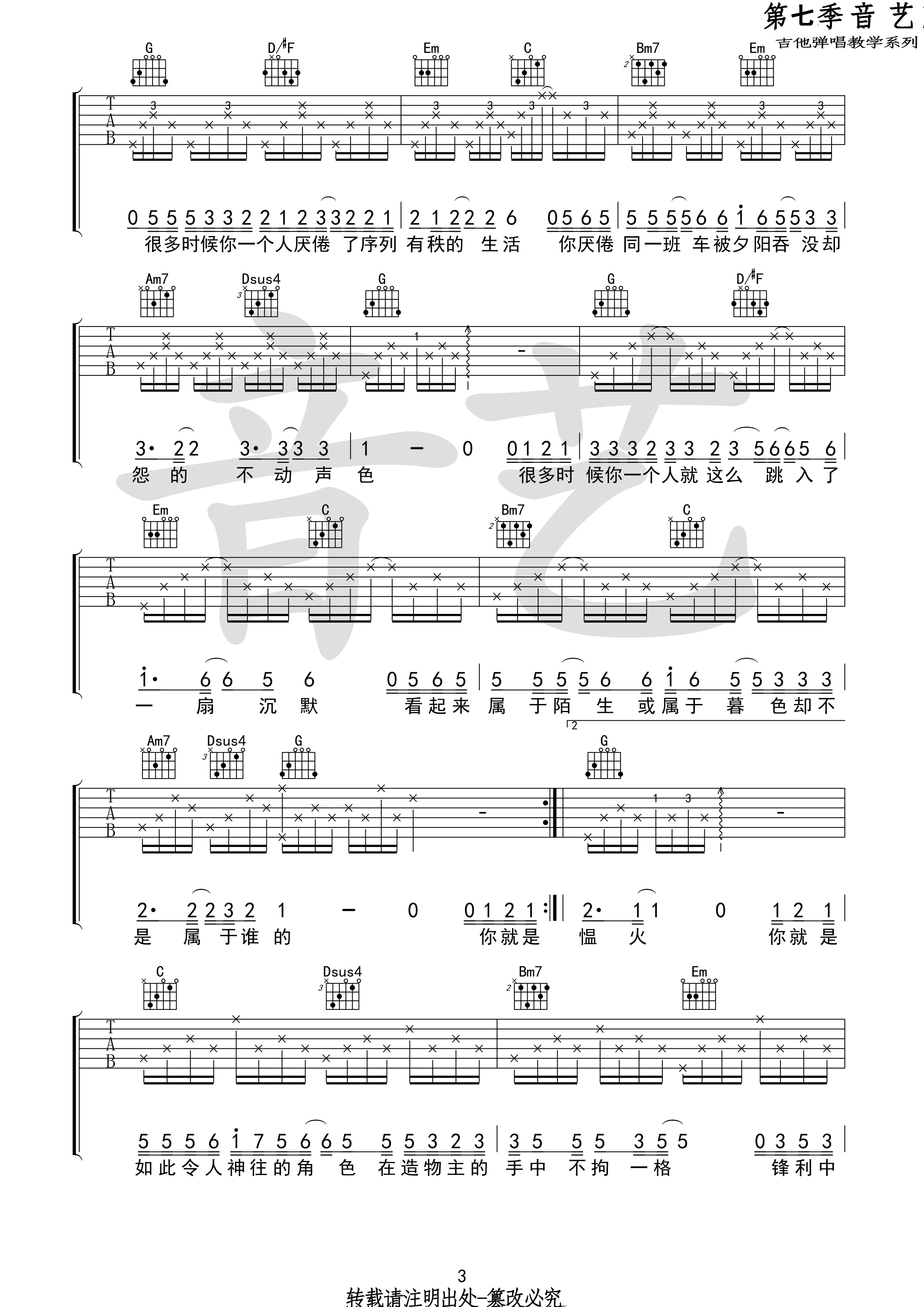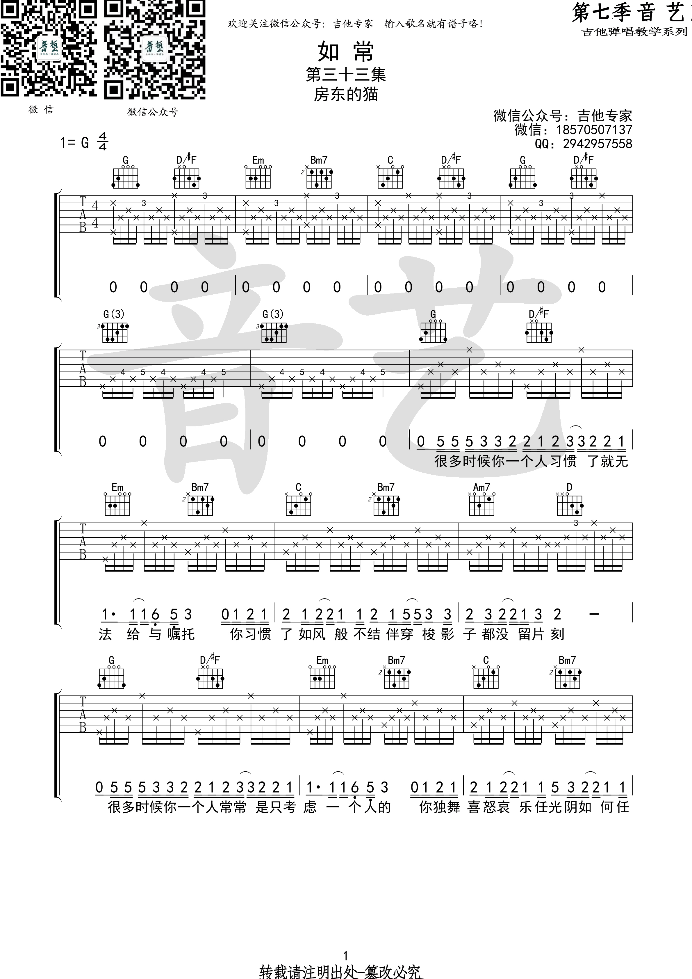 曲谱介绍: 房东的猫《如常》吉他弹唱谱,采用G调指法编配,共有4张高清图谱。