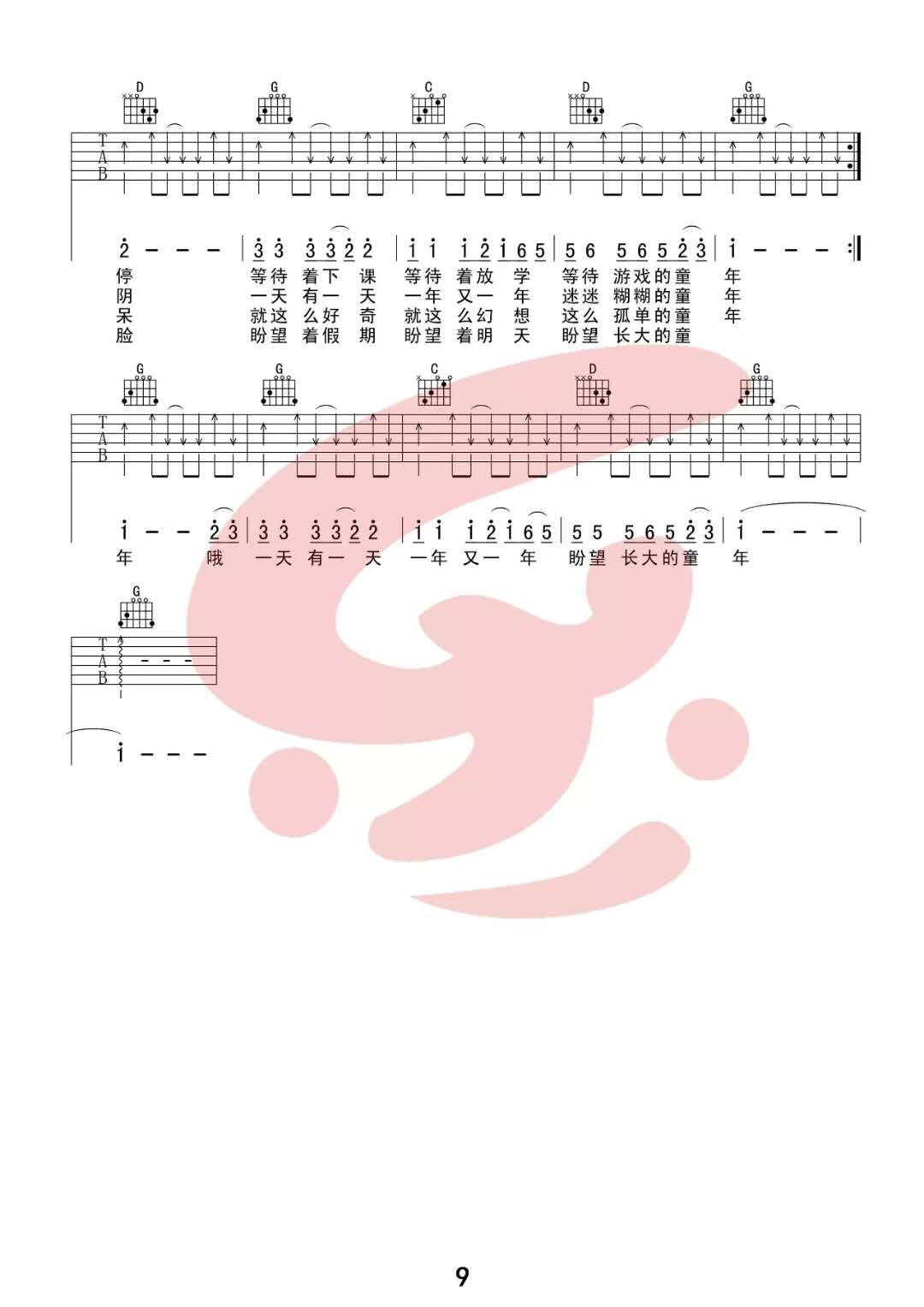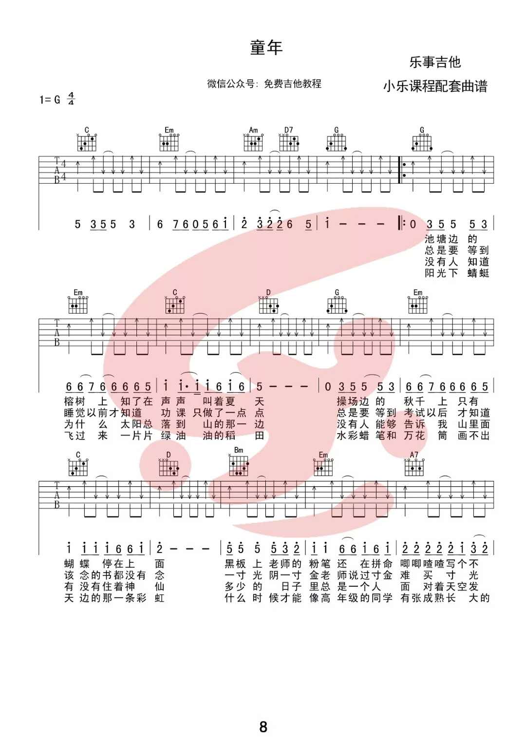 曲谱介绍: 罗大佑《童年》吉他弹唱谱,采用G调指法编配,共有2张高清图谱,免翻页排版设计。