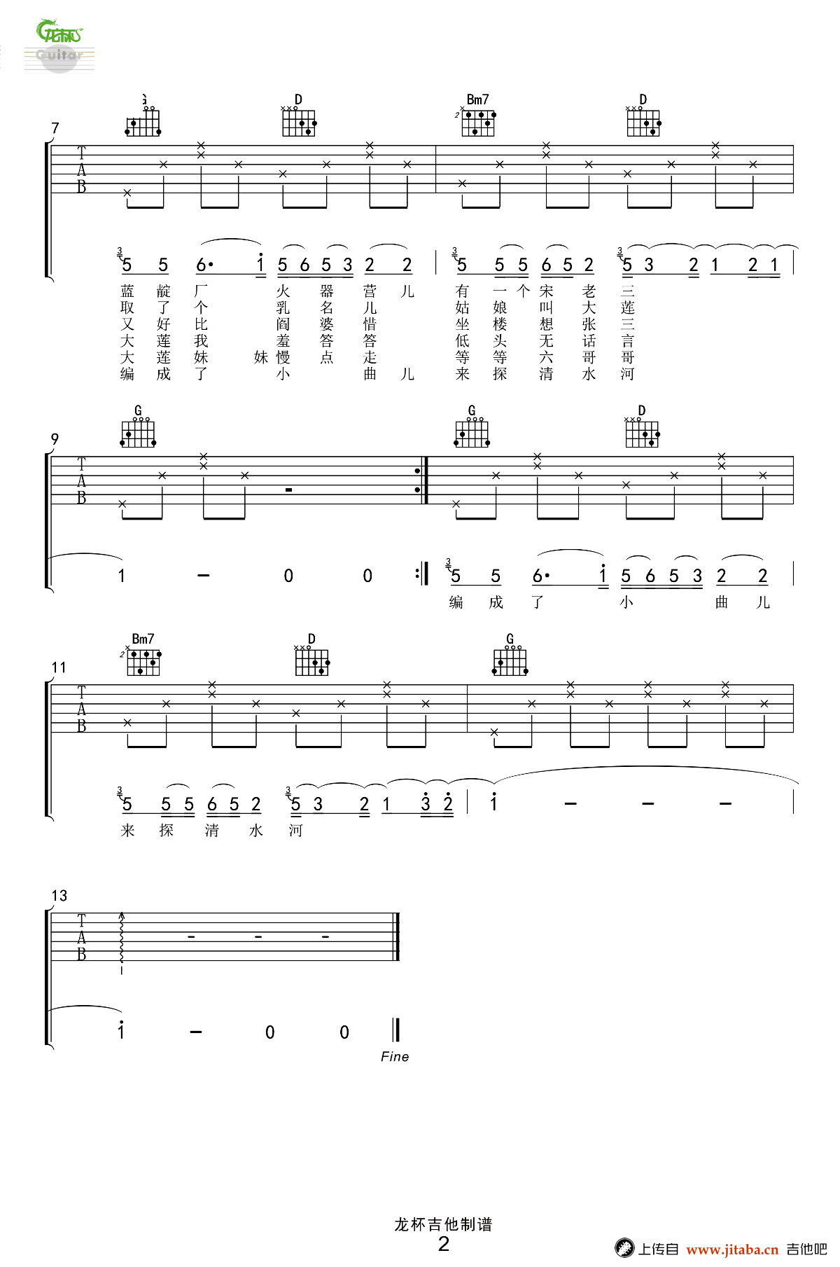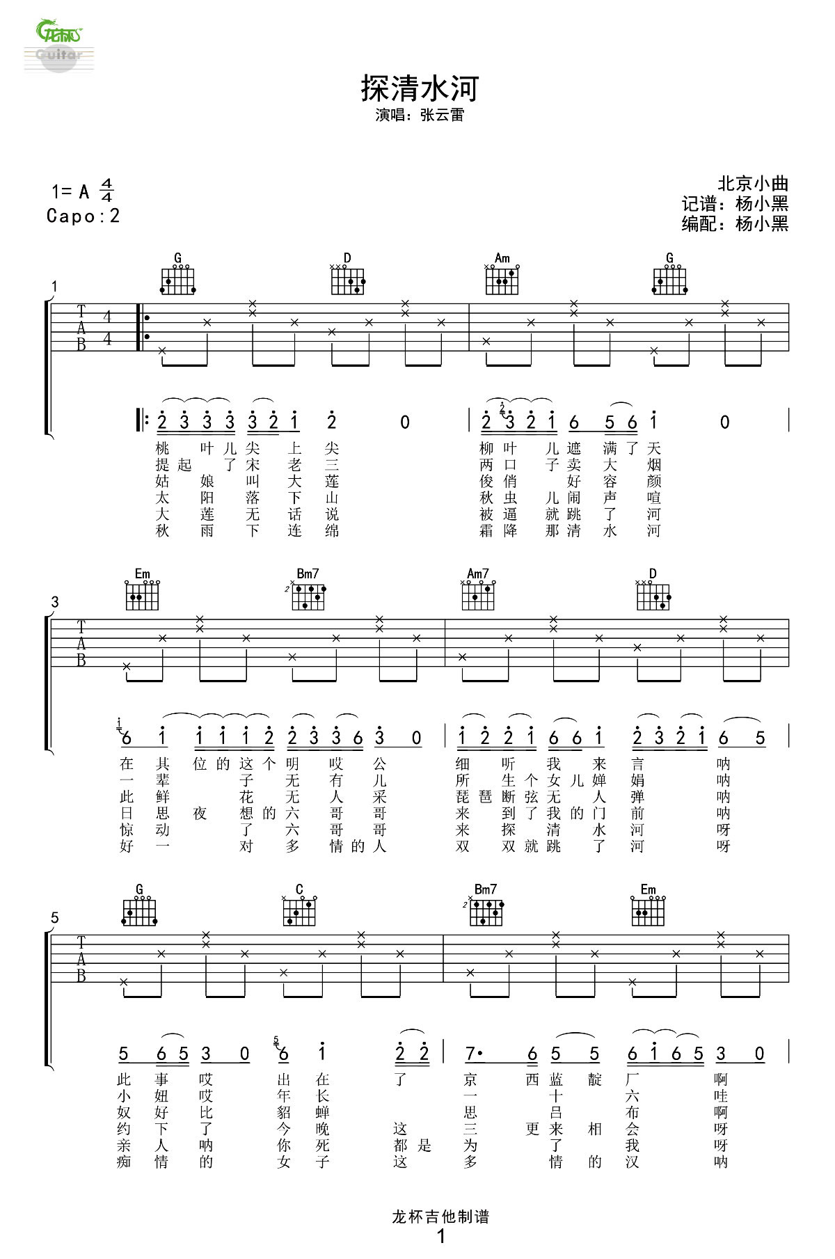 曲谱介绍: 张云雷《探清水河》吉他弹唱谱,采用A调指法编配,共有2张高清图谱,免翻页排版设计。