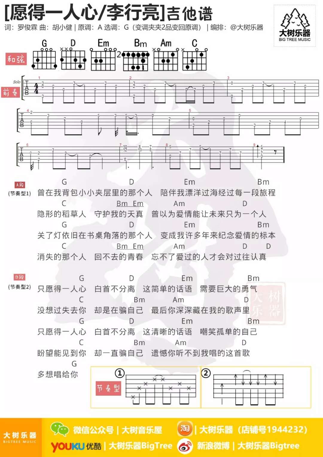 愿得一人心吉他谱 - 李行亮 - G调吉他弹唱谱