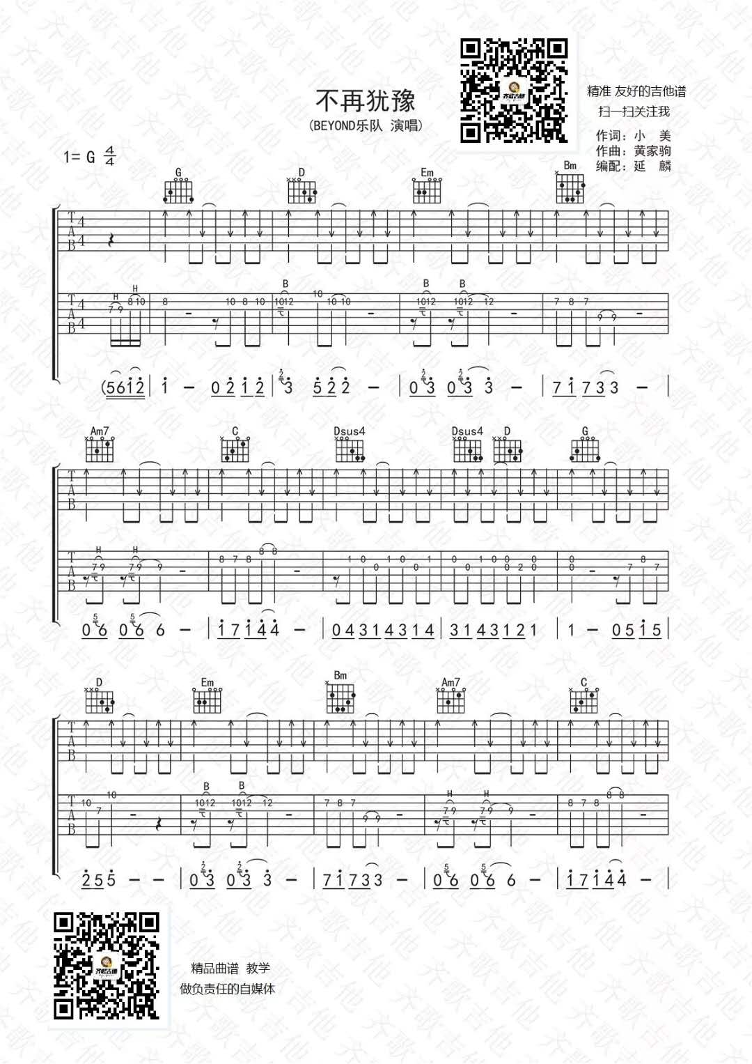 曲谱介绍: Beyond《不再犹豫双吉他版》吉他弹唱谱,采用G调指法编配,共有4张高清图谱。