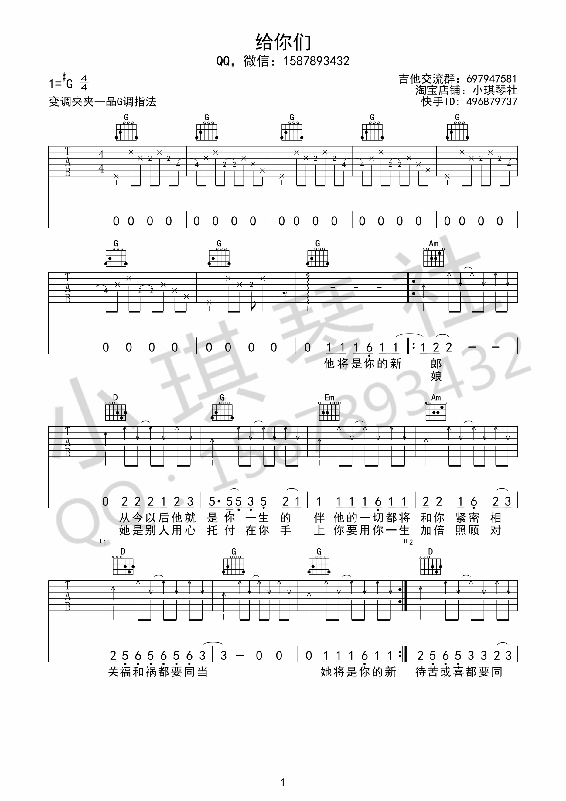 曲谱介绍: 张宇《给你们》吉他弹唱谱,采用G调指法编配,共有3张高清图谱。