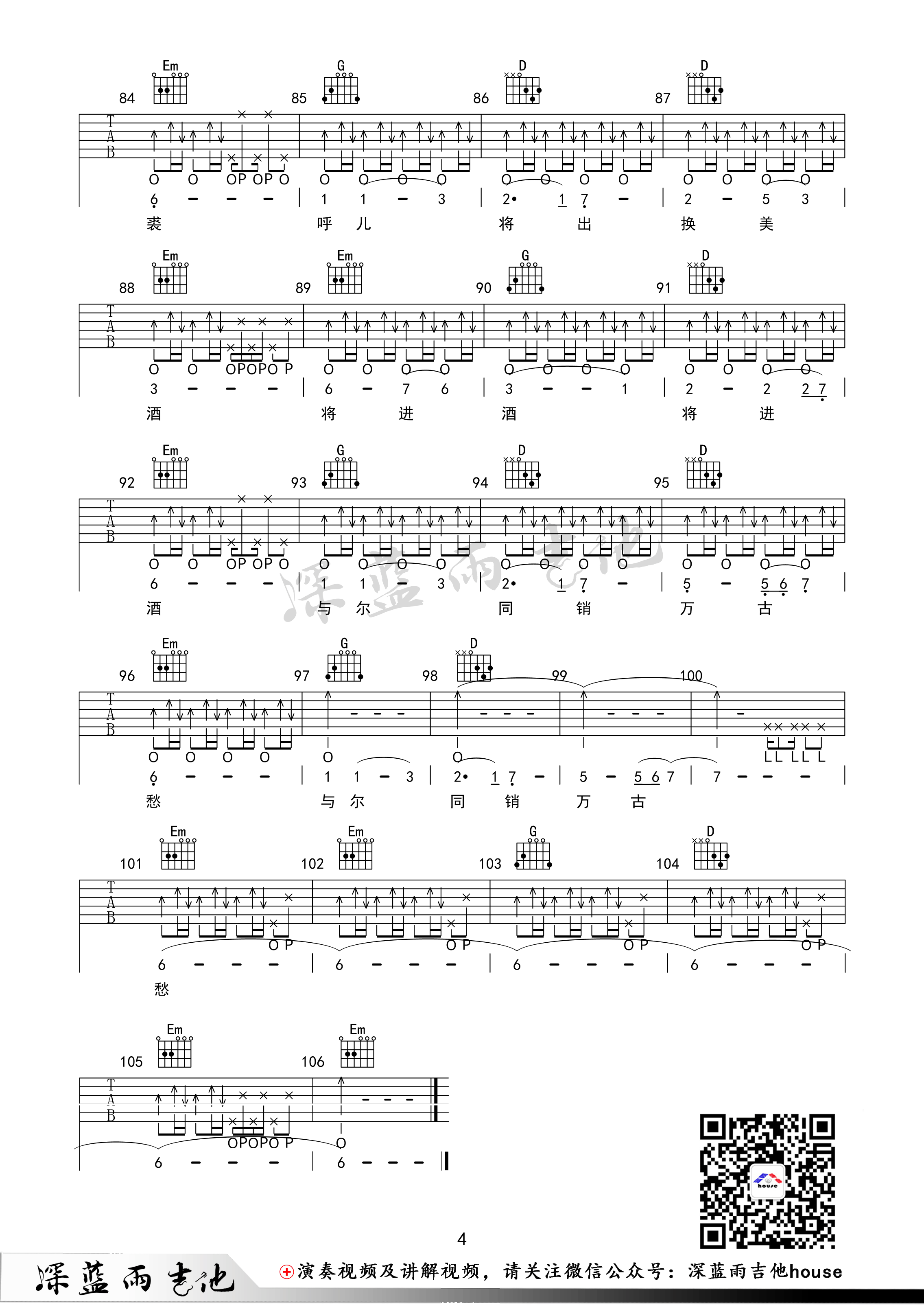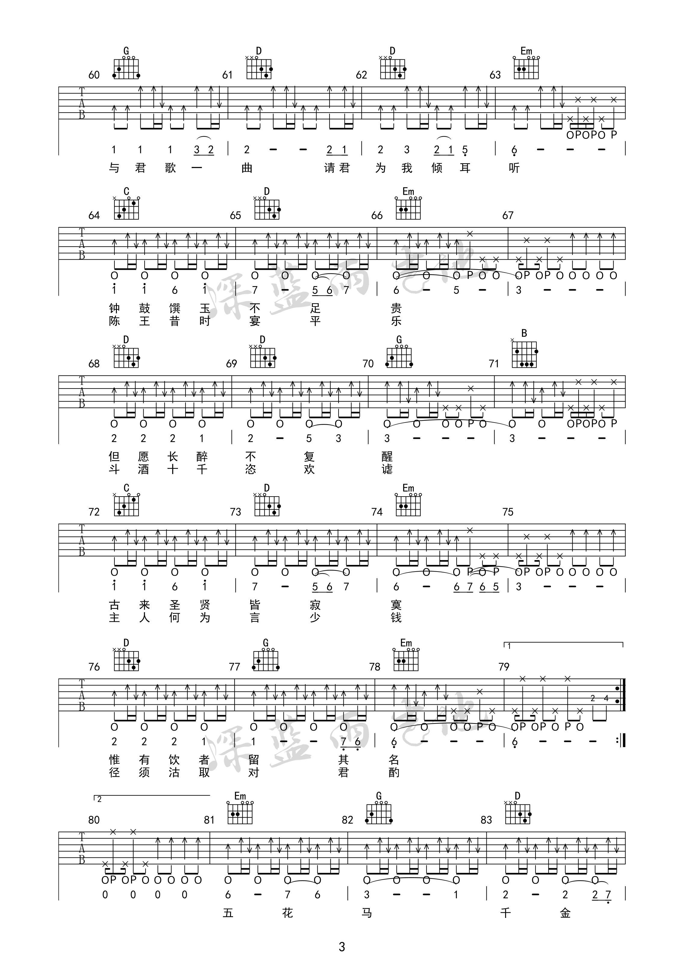 曲谱介绍: 凤凰传奇《将进酒演奏版》吉他弹唱谱,采用G调指法编配,共有4张高清图谱。