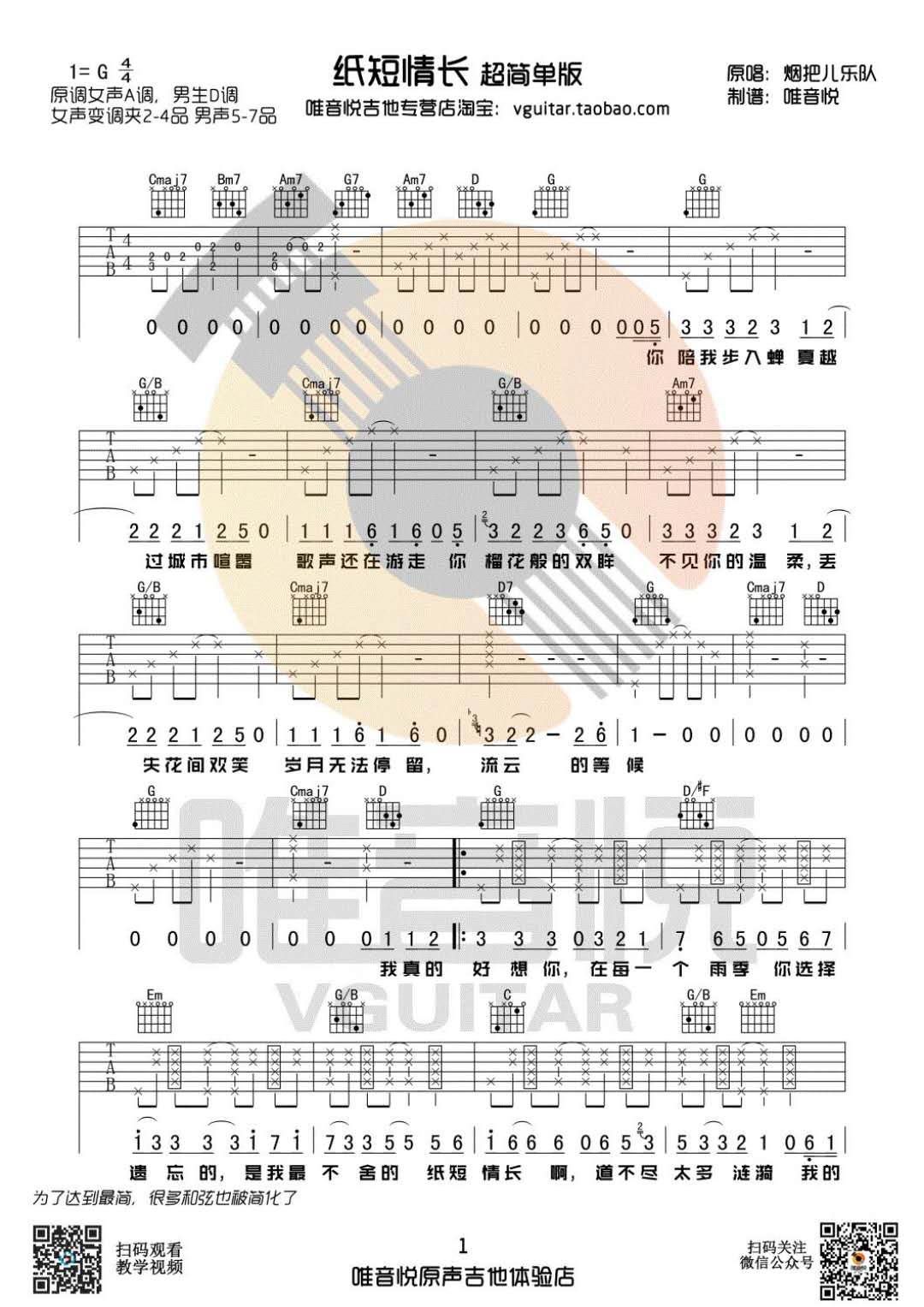 曲谱介绍: 烟把儿乐队《纸短情长简单版》吉他弹唱谱,采用G调指法编配,共有2张高清图谱,免翻页排版设计。