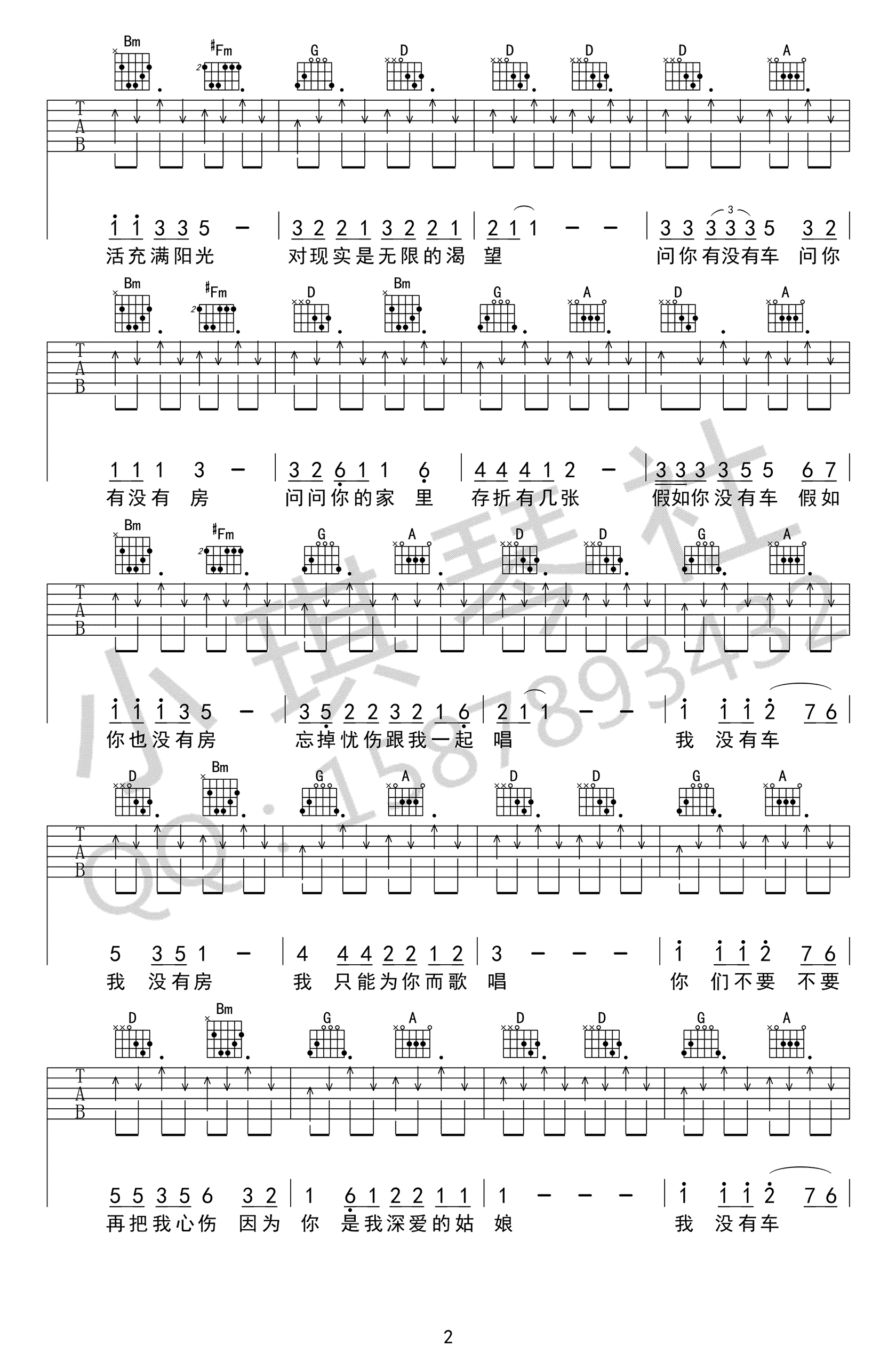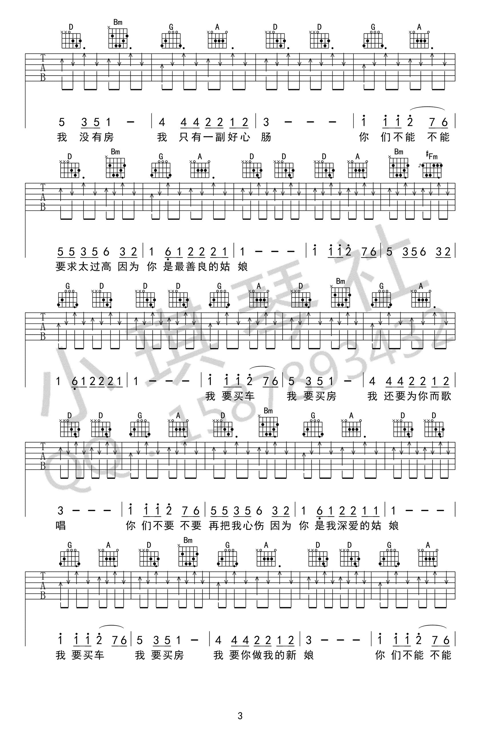 曲谱介绍: 孙辉《没有车没有房》吉他弹唱谱,采用D调指法编配,共有4张高清图谱。