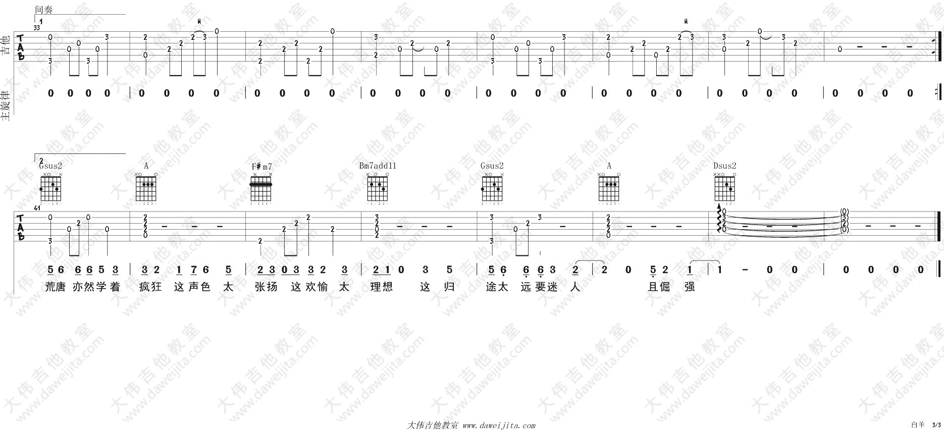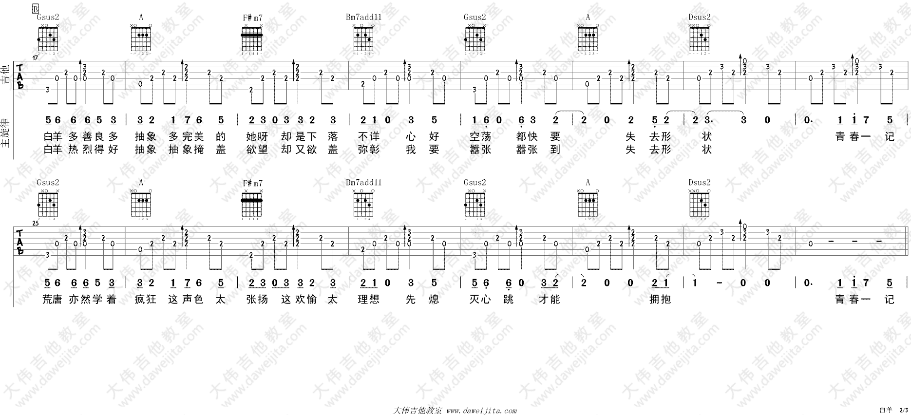 曲谱介绍: 徐秉龙,沈以诚《白羊》吉他弹唱谱,采用D调指法编配,共有3张高清图谱。