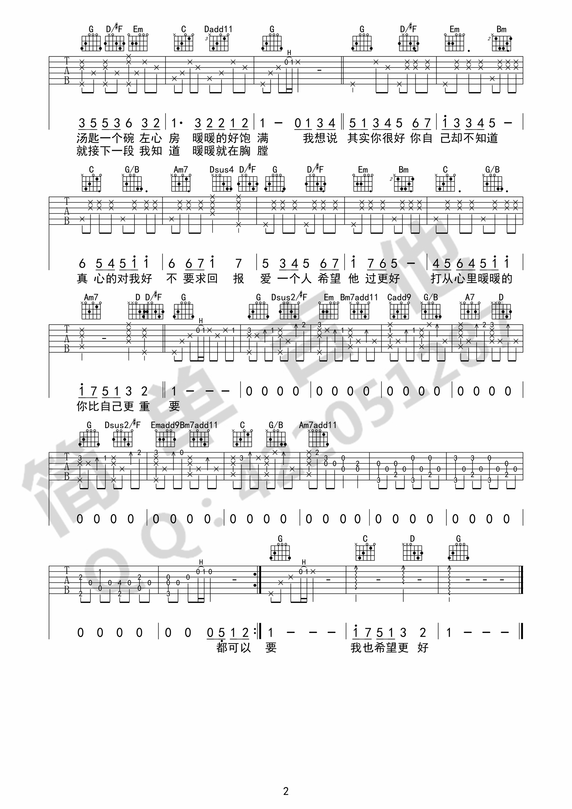 曲谱介绍: 梁静茹《暖暖》吉他弹唱谱,采用G调指法编配,共有2张高清图谱,免翻页排版设计。