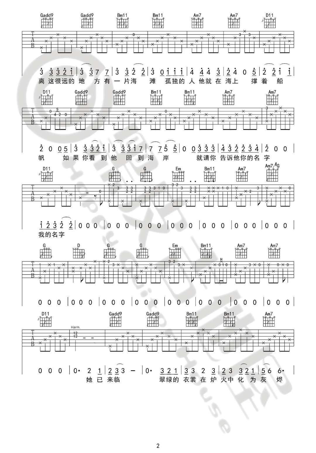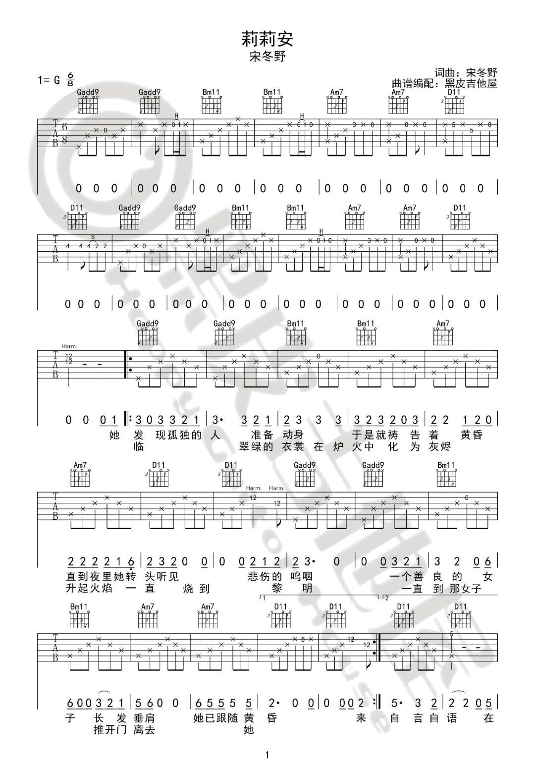曲谱介绍: 宋冬野《莉莉安》吉他弹唱谱,采用G调指法编配,共有3张高清图谱。