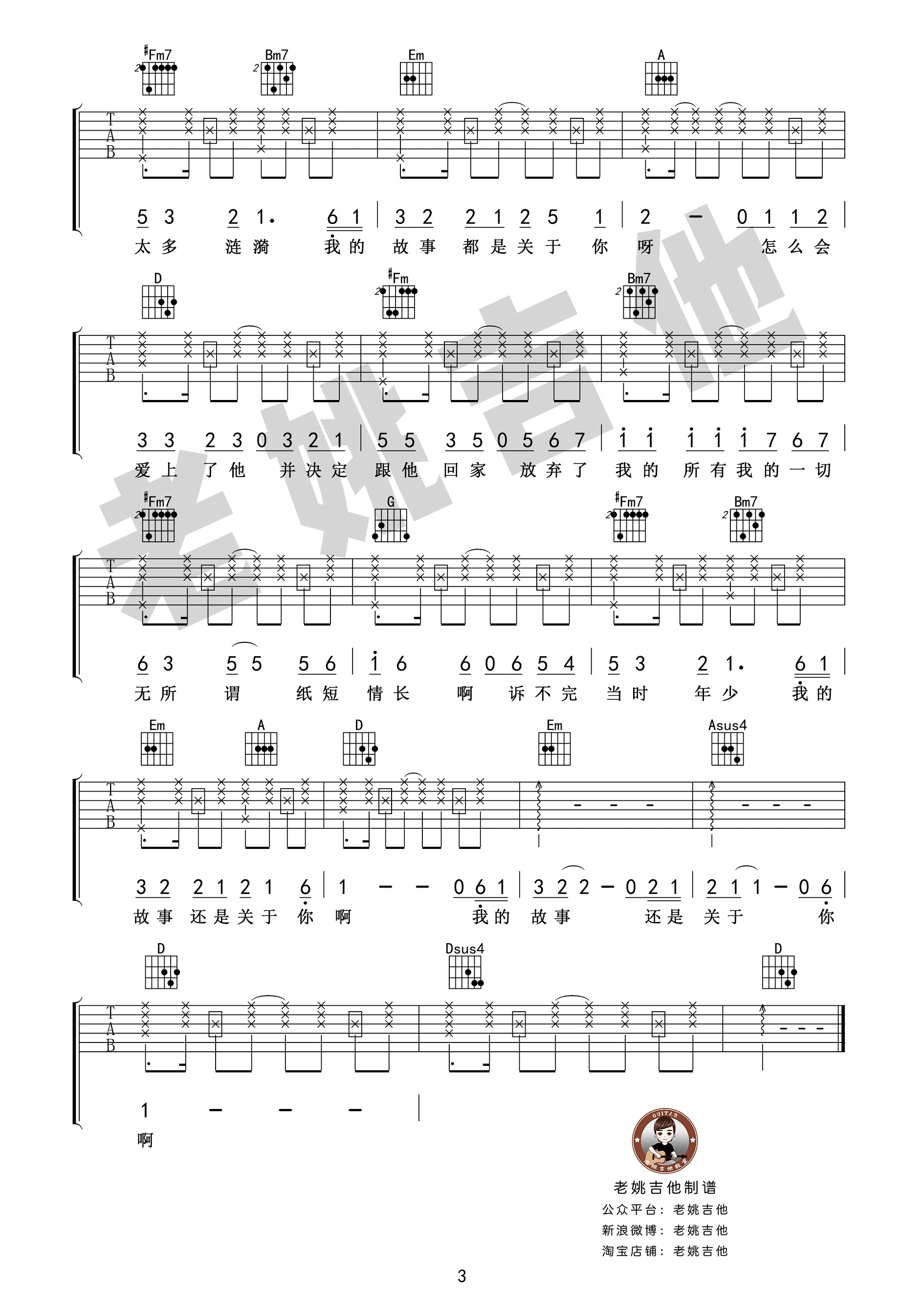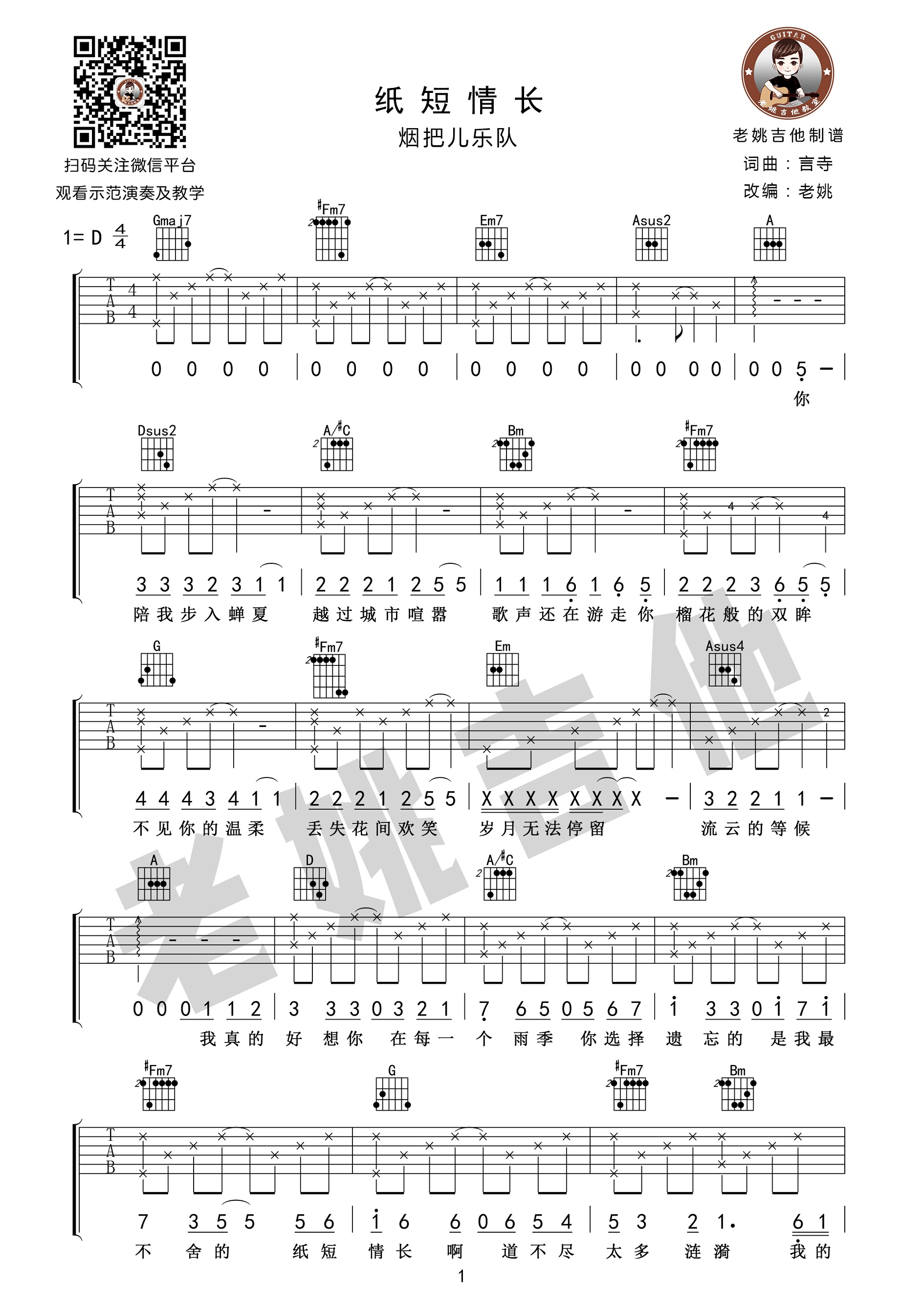 曲谱介绍: 烟把儿乐队《纸短情长》吉他弹唱谱,采用D调指法编配,共有3张高清图谱。