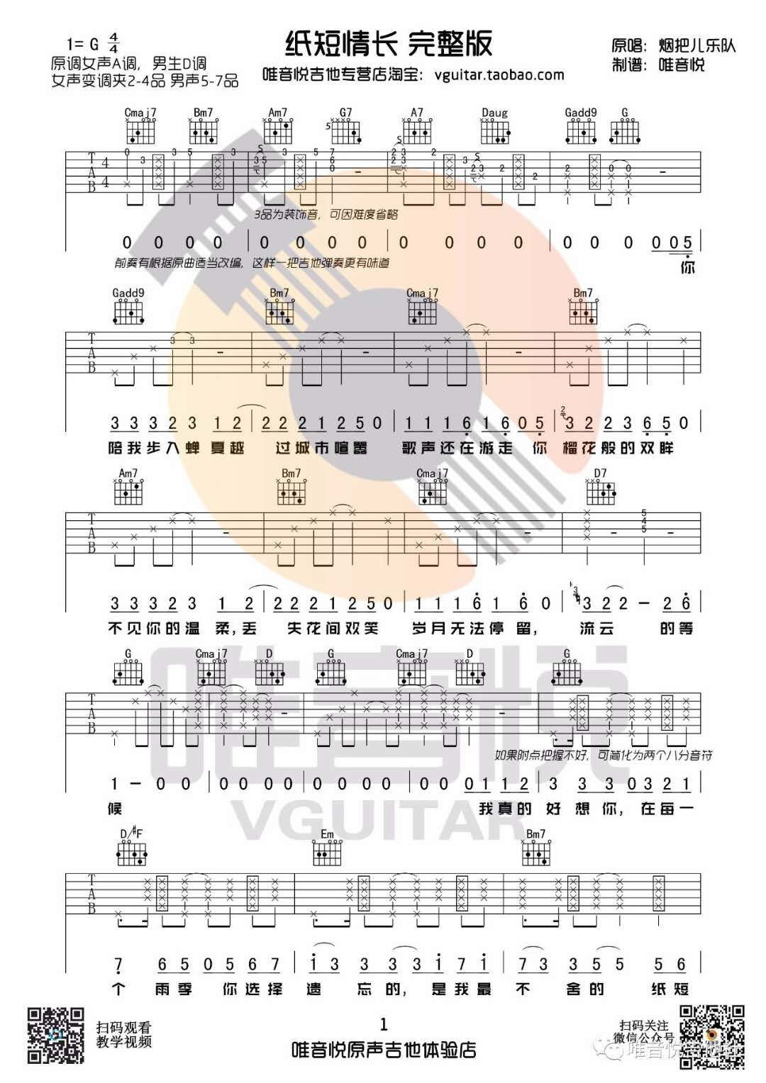 曲谱介绍: 烟把儿乐队《纸短情长完整版》吉他弹唱谱,采用G调指法编配,共有3张高清图谱。