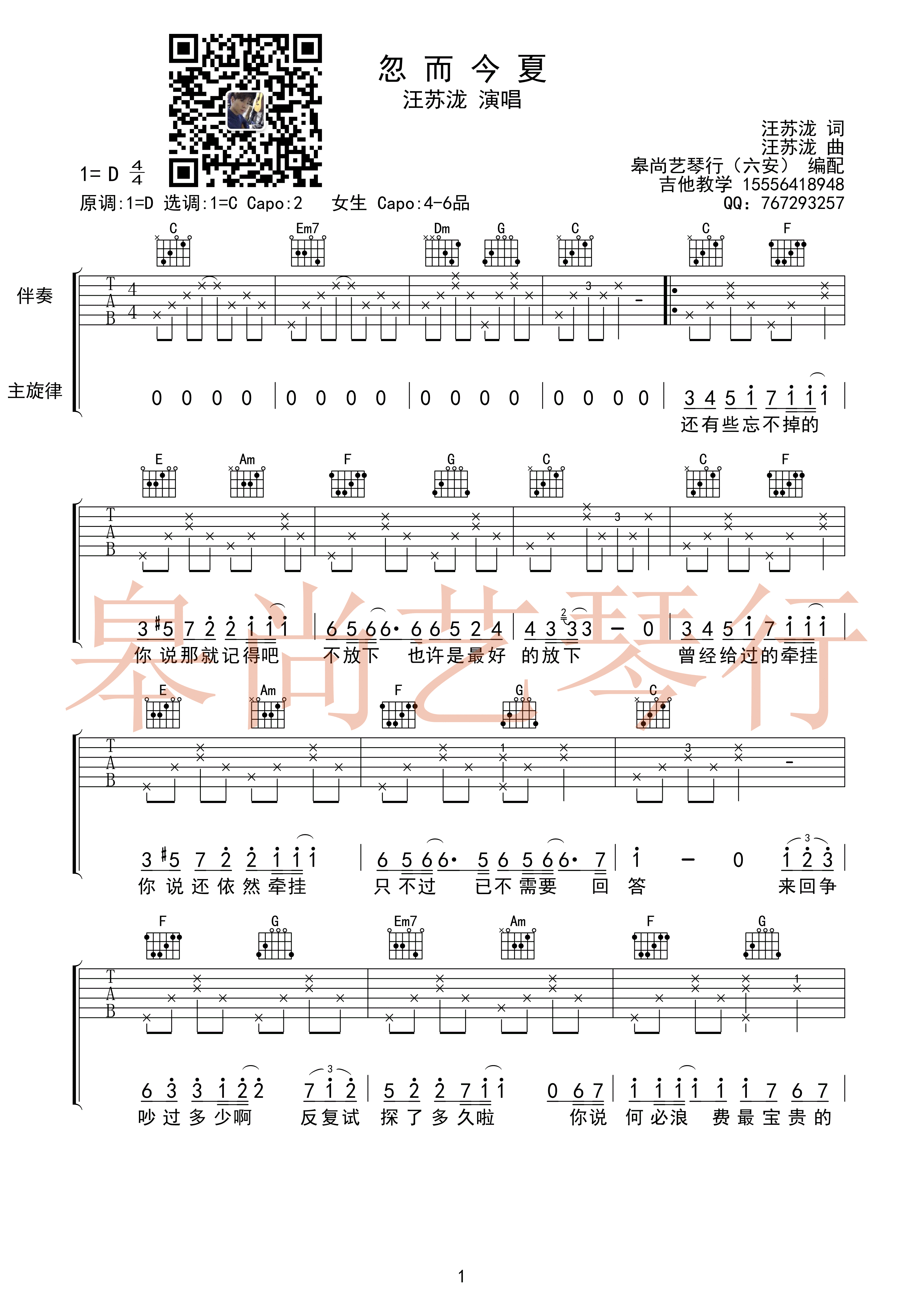 忽而今夏吉他谱 - 汪苏泷 - D调吉他弹唱谱