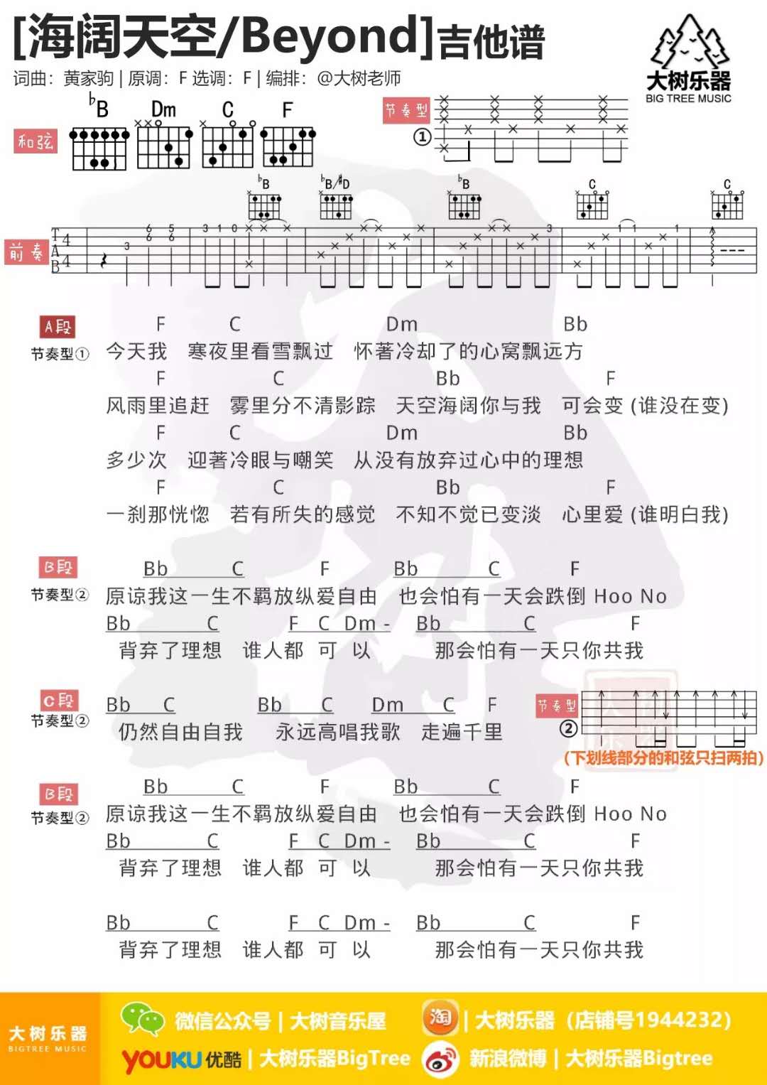 曲谱介绍: Beyond《海阔天空》吉他弹唱谱,采用F调指法编配,共有1张高清图谱,免翻页排版设计。