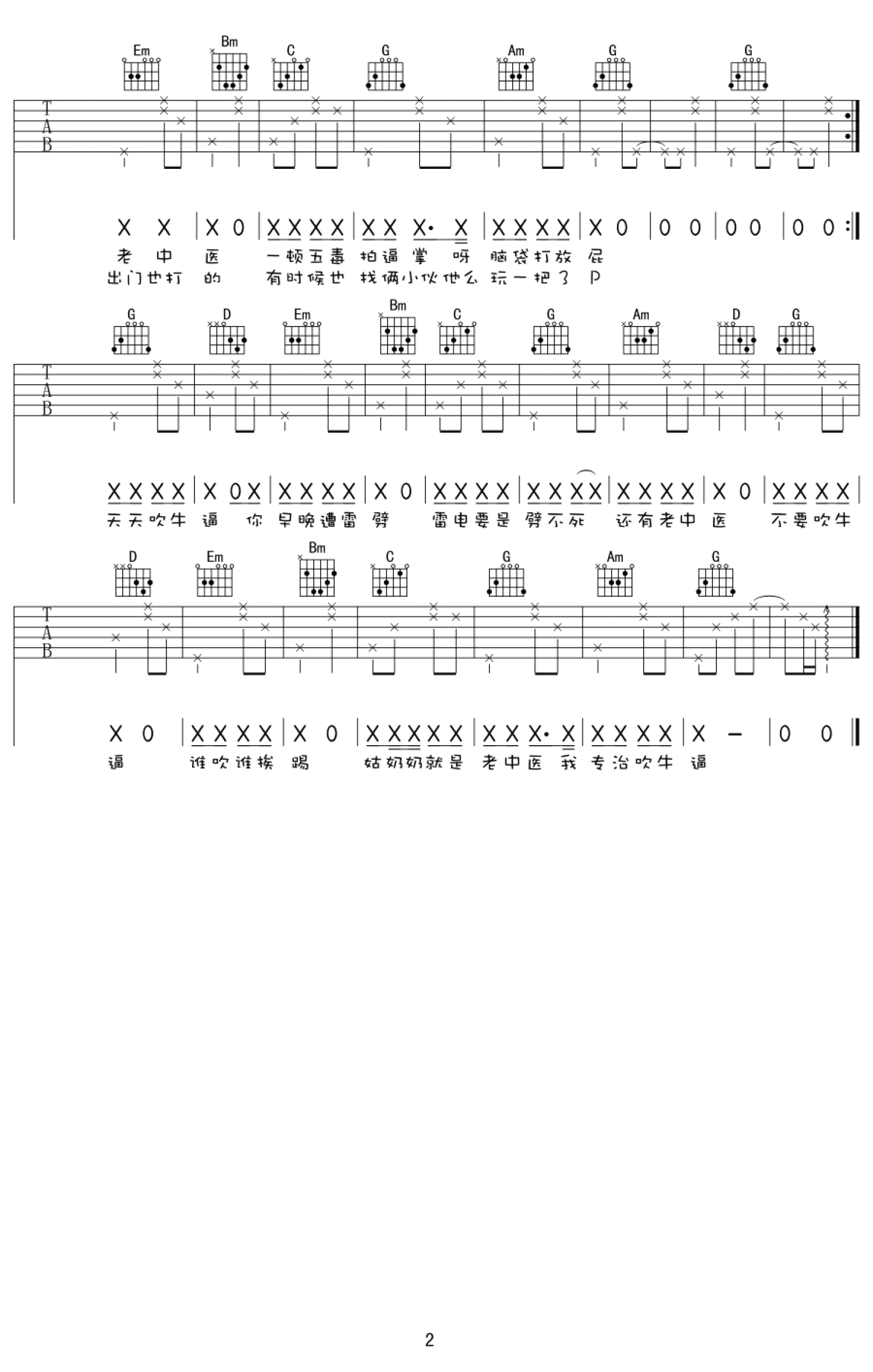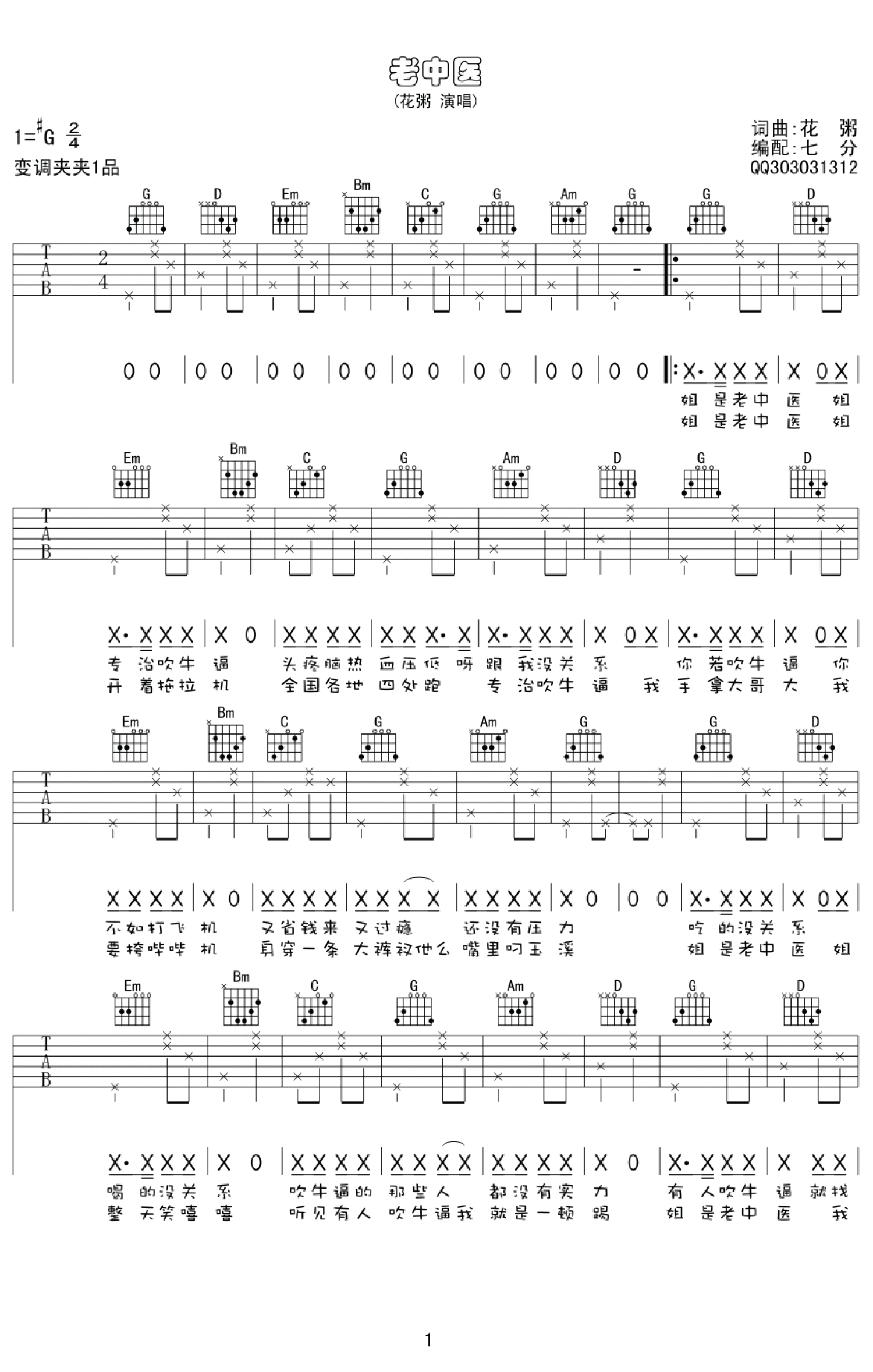 曲谱介绍: 花粥《老中医》吉他谱,G调弹唱谱,变调夹夹一品。花大爷的小黄歌,朗朗上口的旋律,小清新重口味的风格,唱出装逼遭雷劈的内涵。