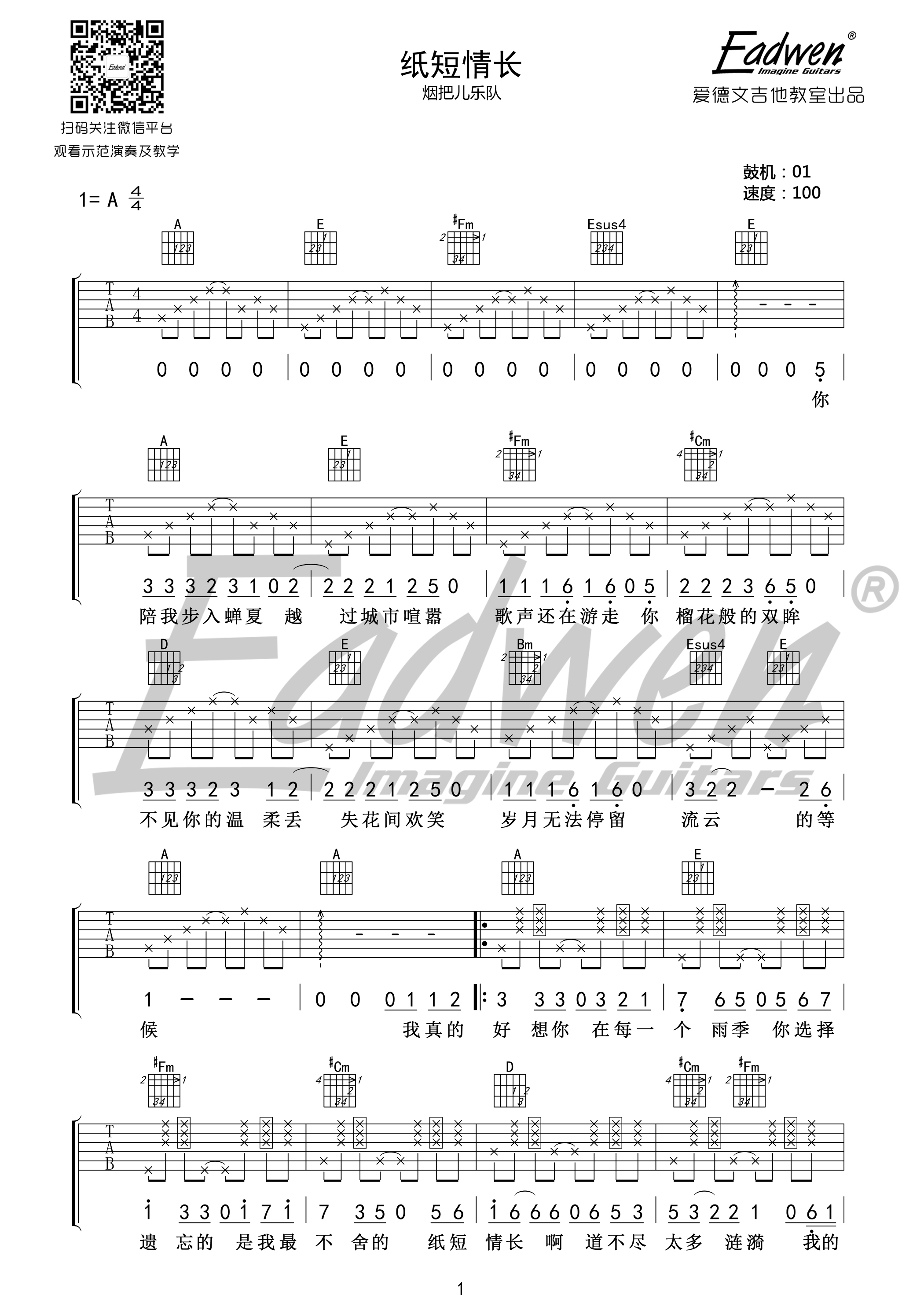 曲谱介绍: 烟把儿乐队《纸短情长》吉他弹唱谱,采用A调指法编配,共有2张高清图谱,免翻页排版设计。
