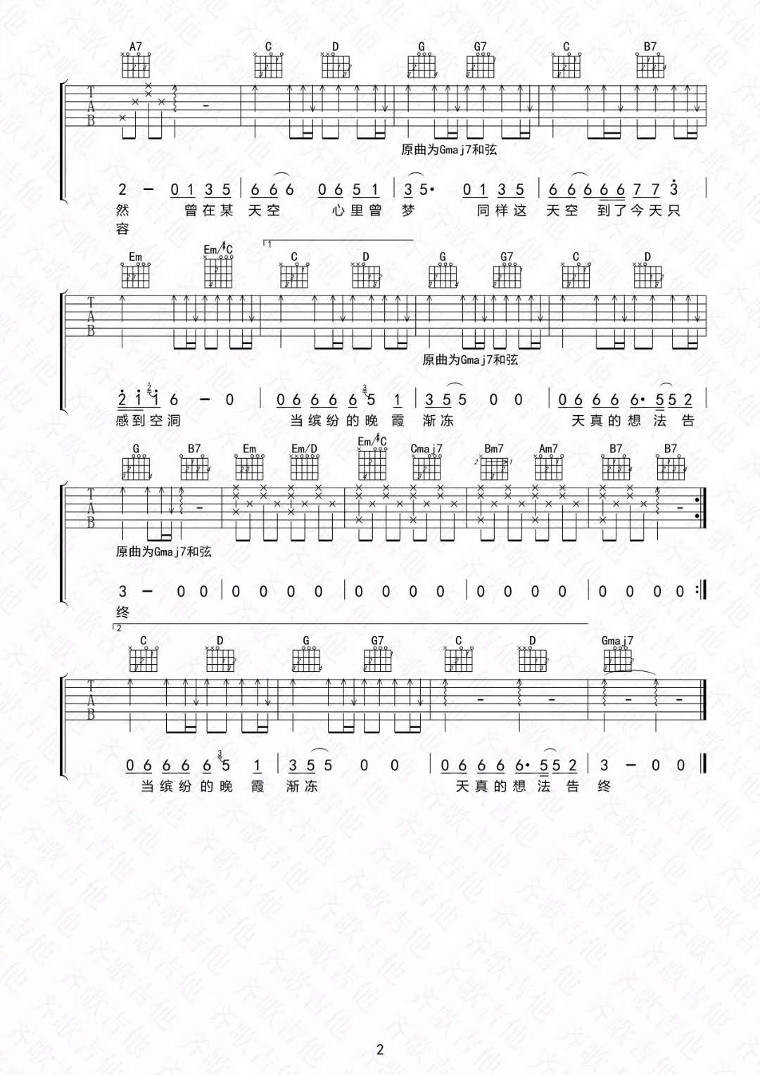 曲谱介绍: 王菲《回忆是红色天空》吉他弹唱谱,采用A调指法编配,共有2张高清图谱,免翻页排版设计。