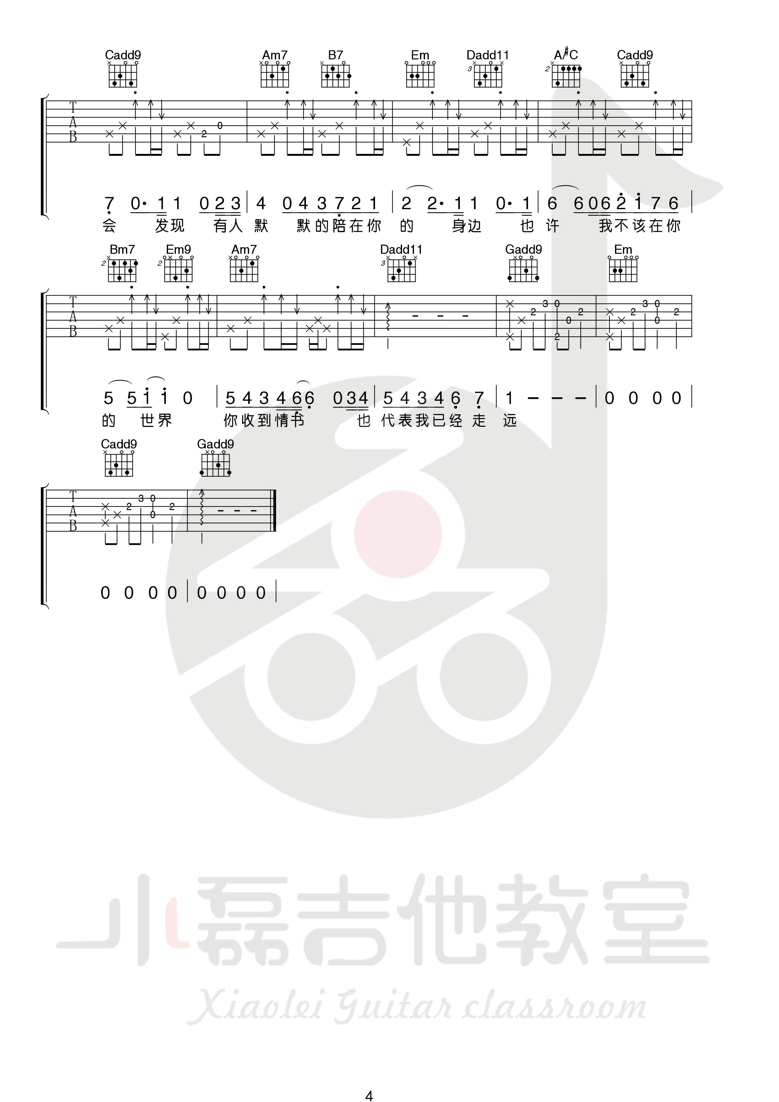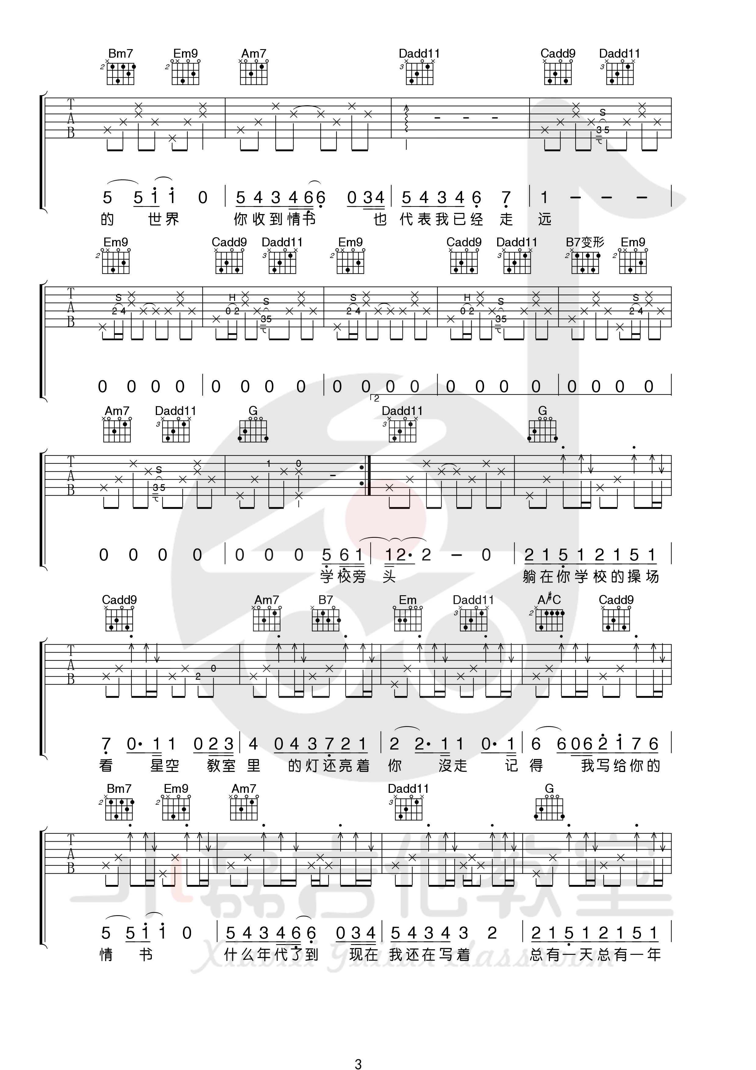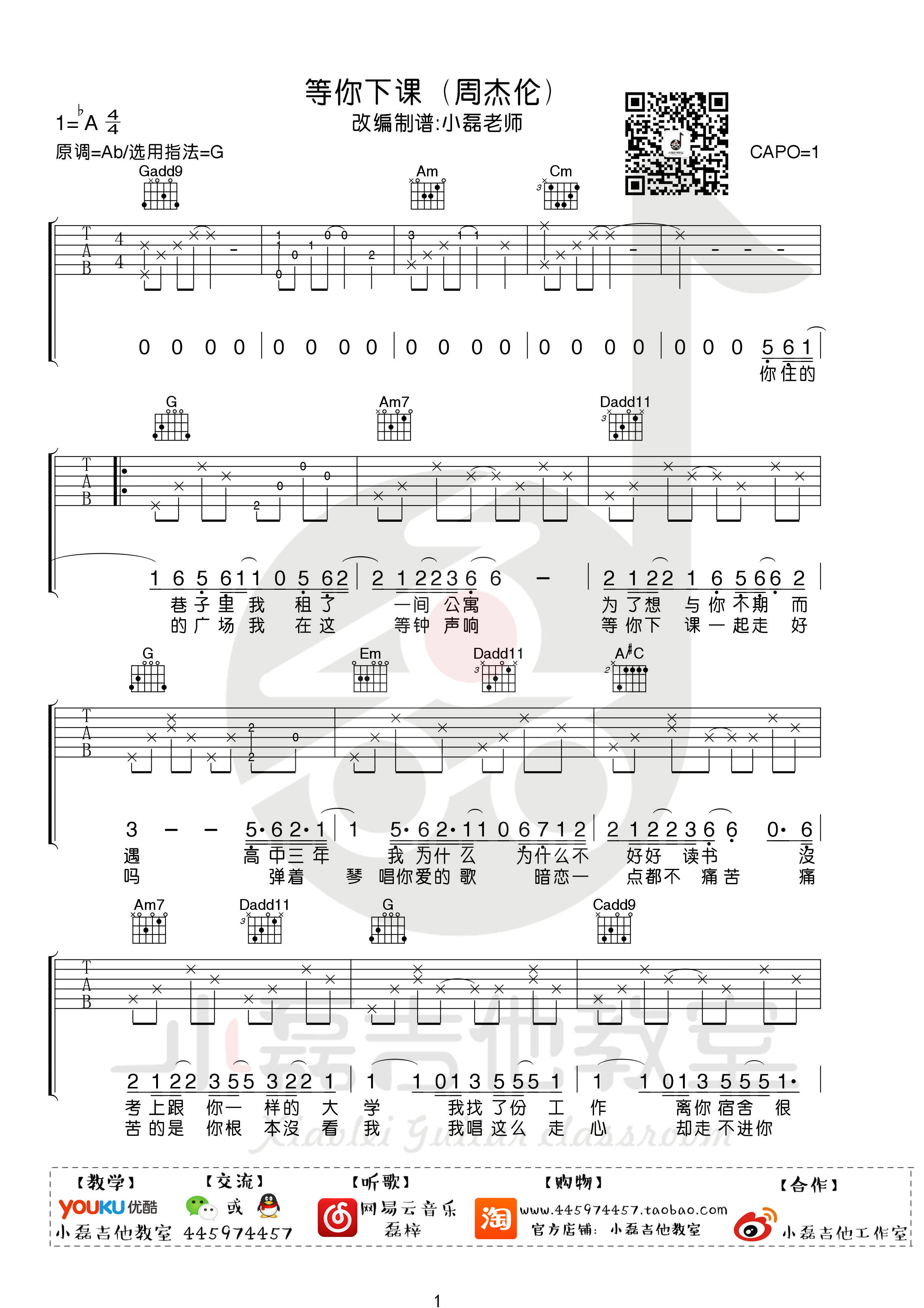 曲谱介绍: 周杰伦《等你下课》吉他弹唱谱,采用A调指法编配,共有4张高清图谱。