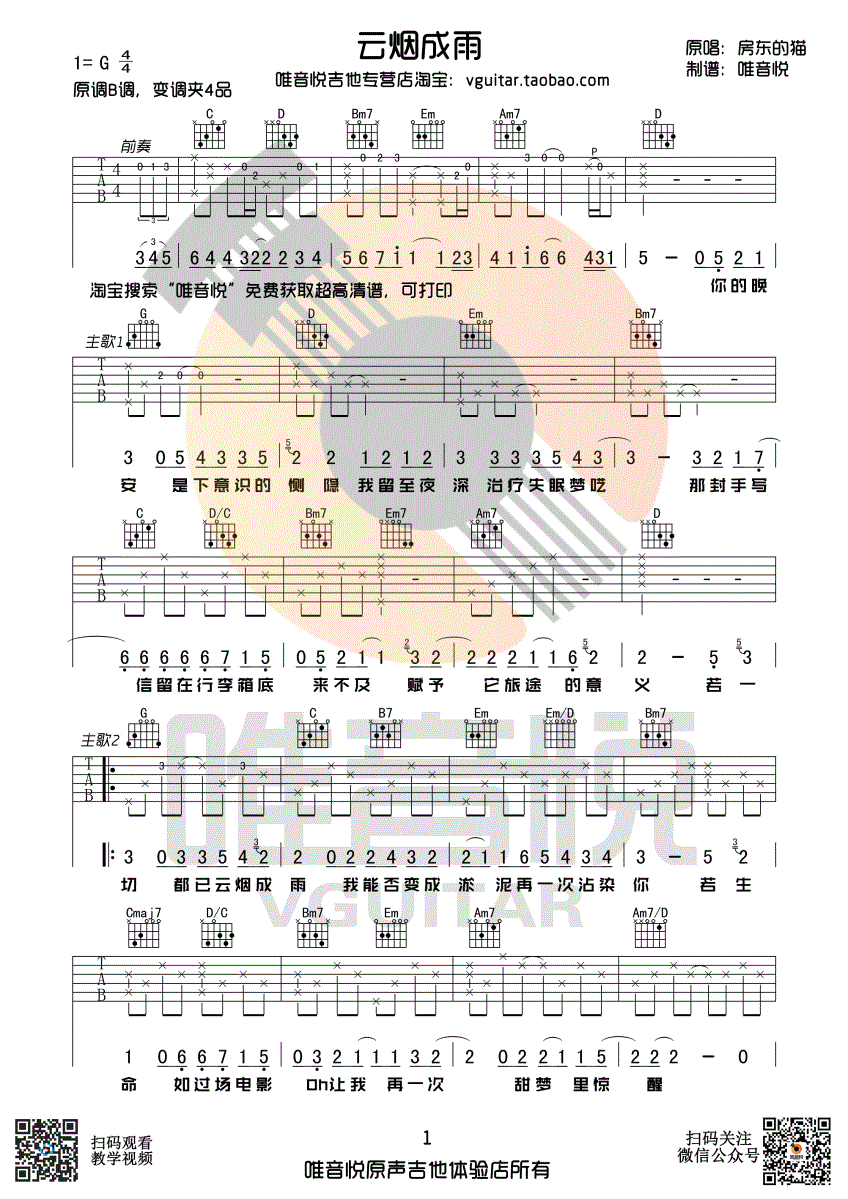 曲谱介绍: 房东的猫《云烟成语》吉他弹唱谱,采用G调指法编配,共有3张高清图谱。