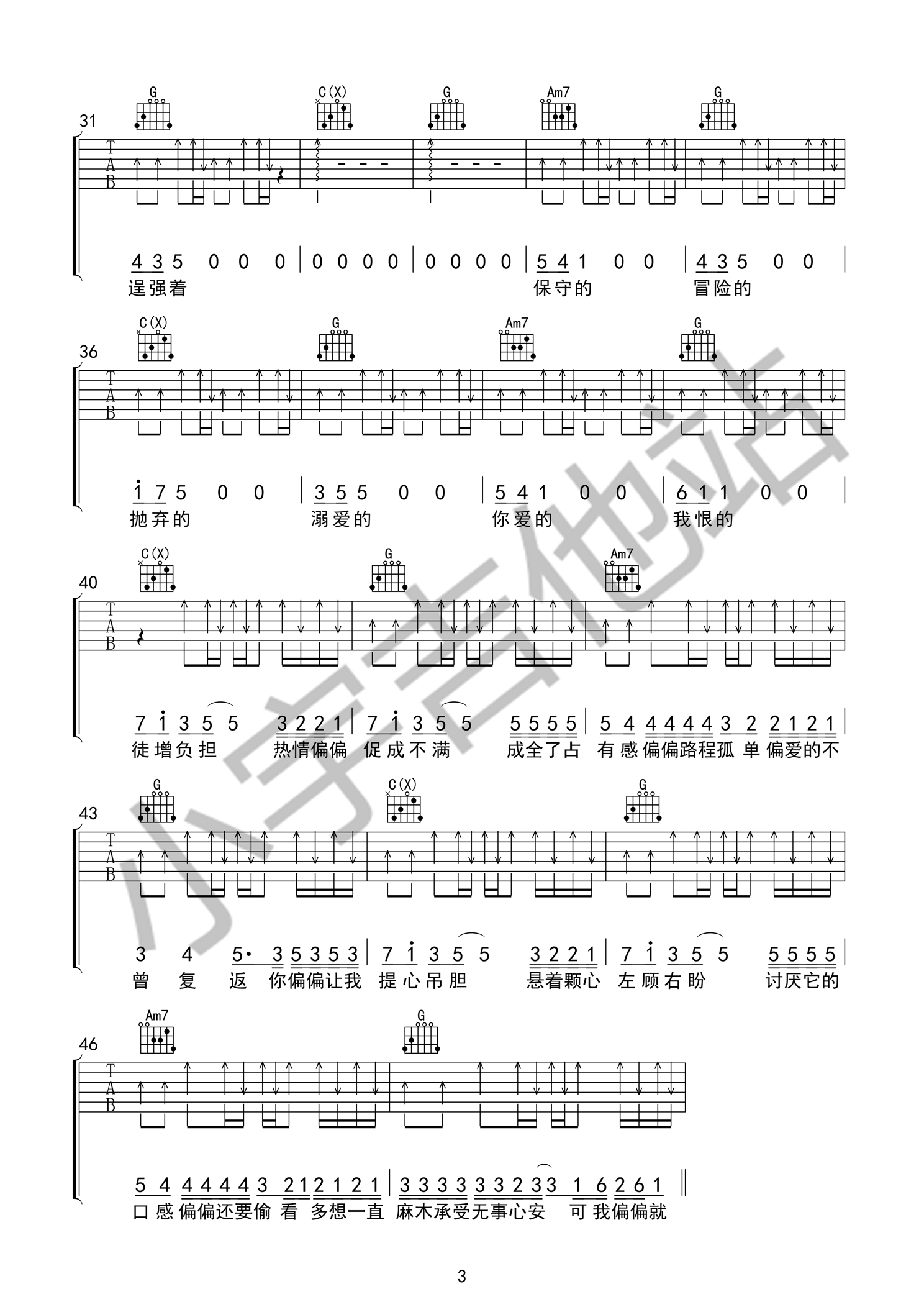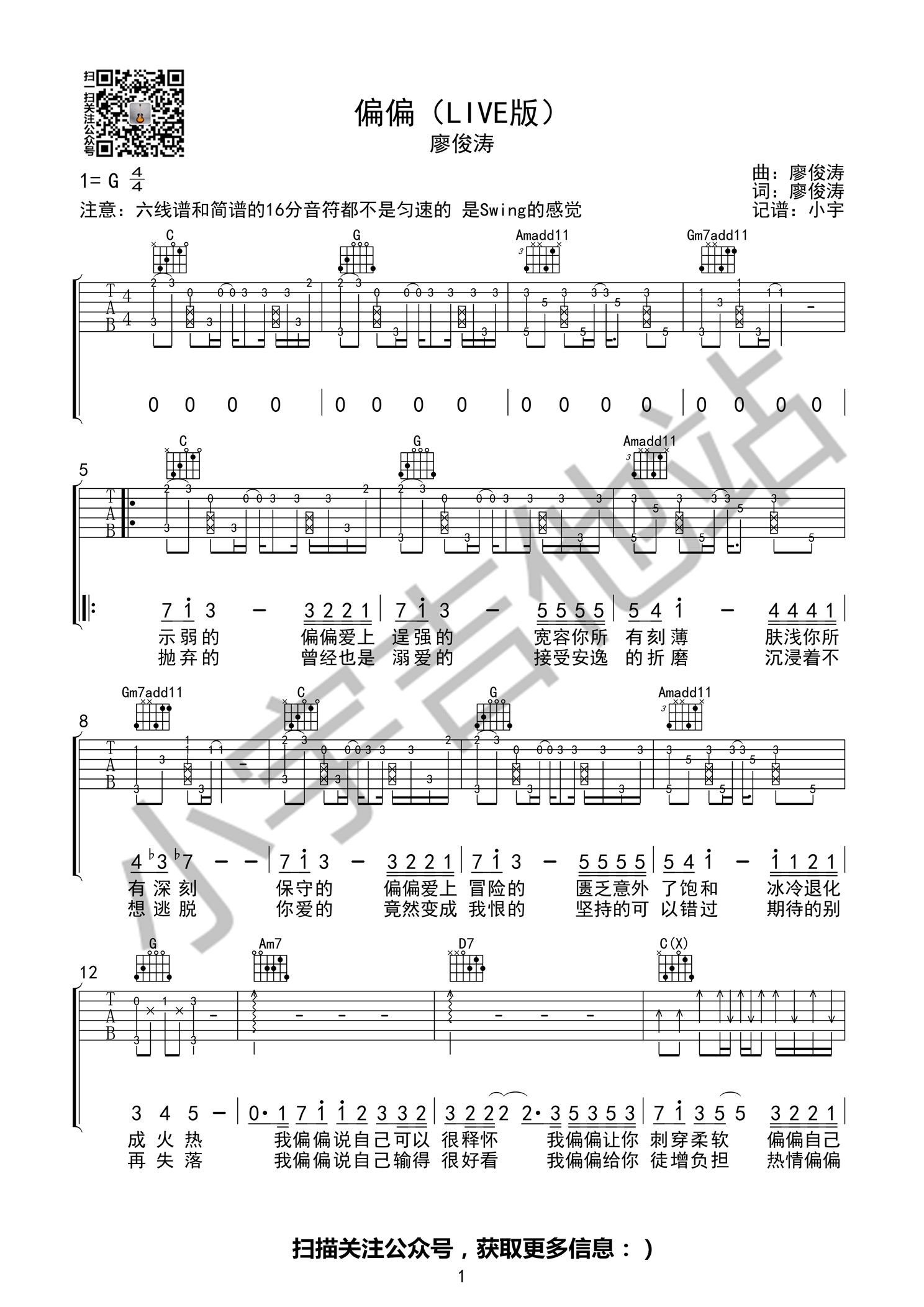 曲谱介绍: 廖俊涛《偏偏》吉他弹唱谱,采用G调指法编配,共有3张高清图谱。