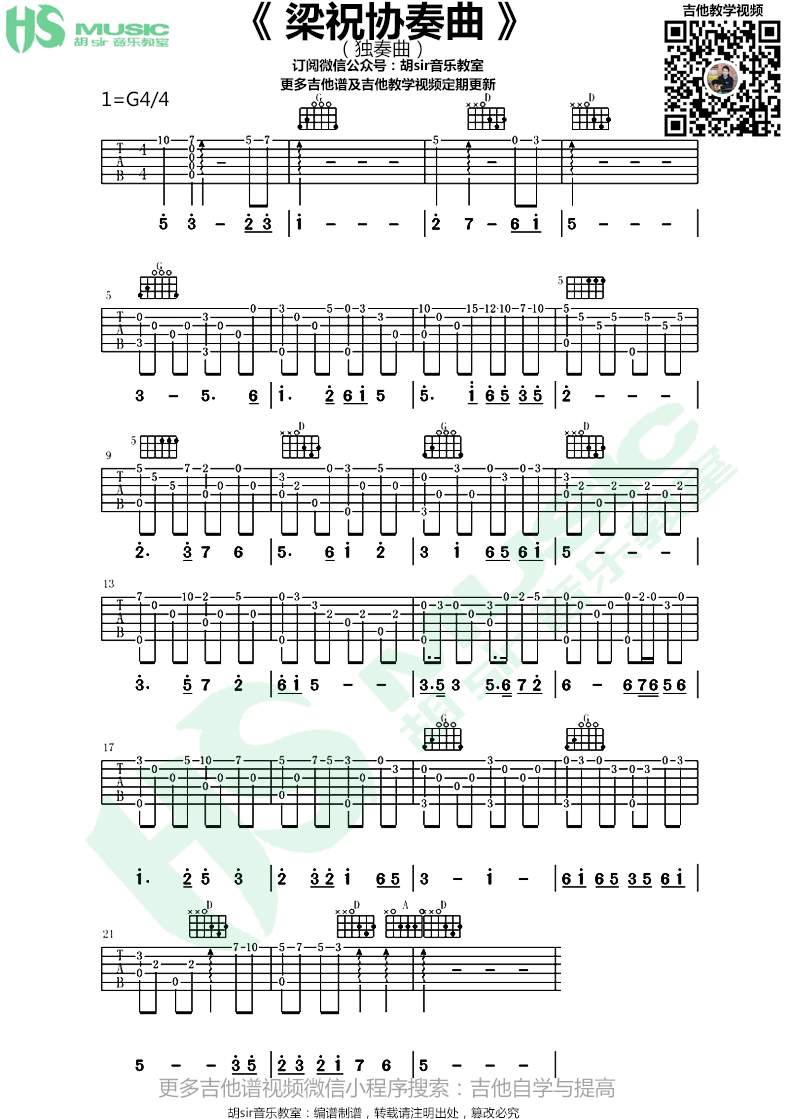 曲谱介绍: 名曲《梁祝协奏曲》吉他独奏谱,采用G调指法编配,共有1张高清图谱,免翻页排版设计。