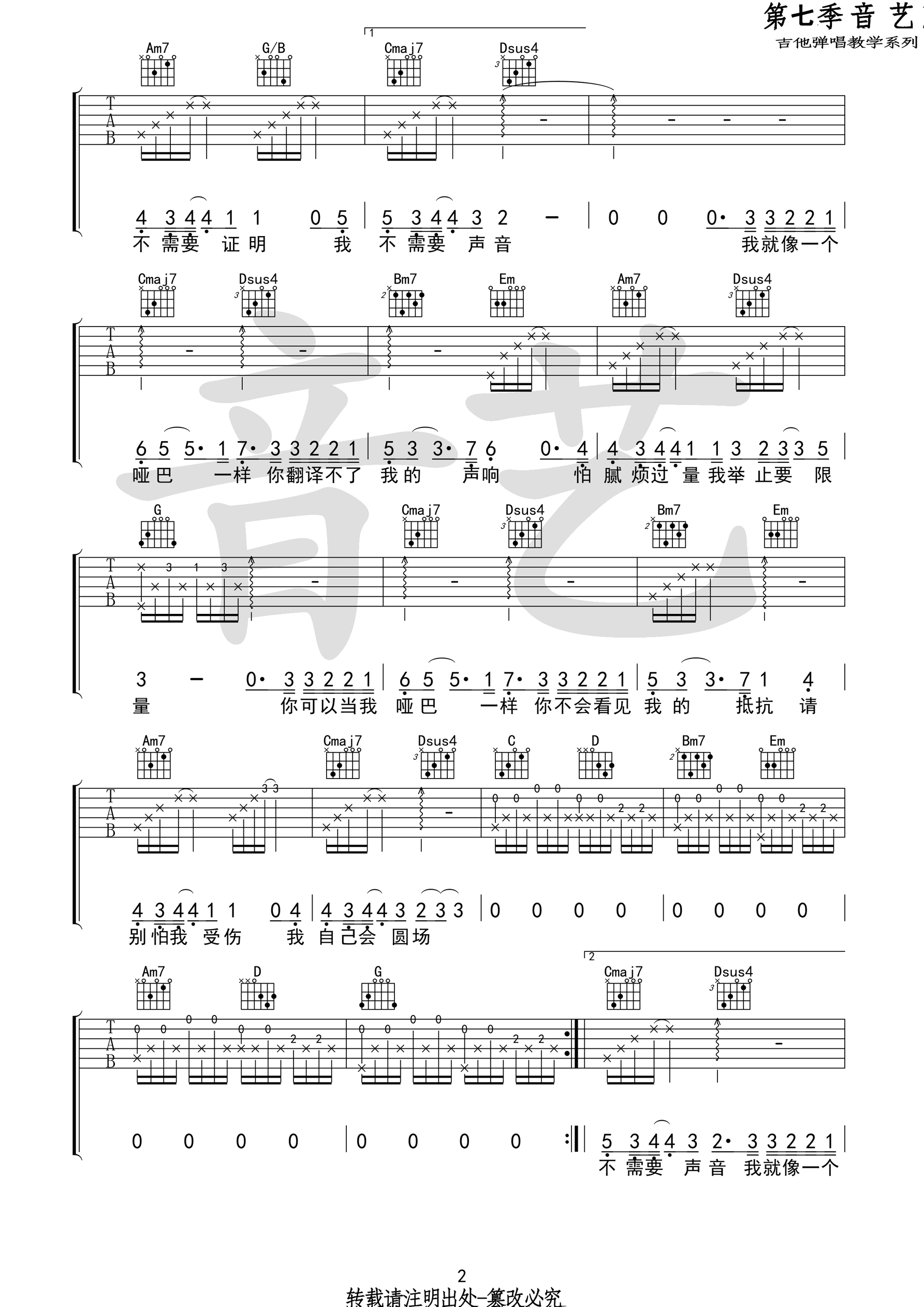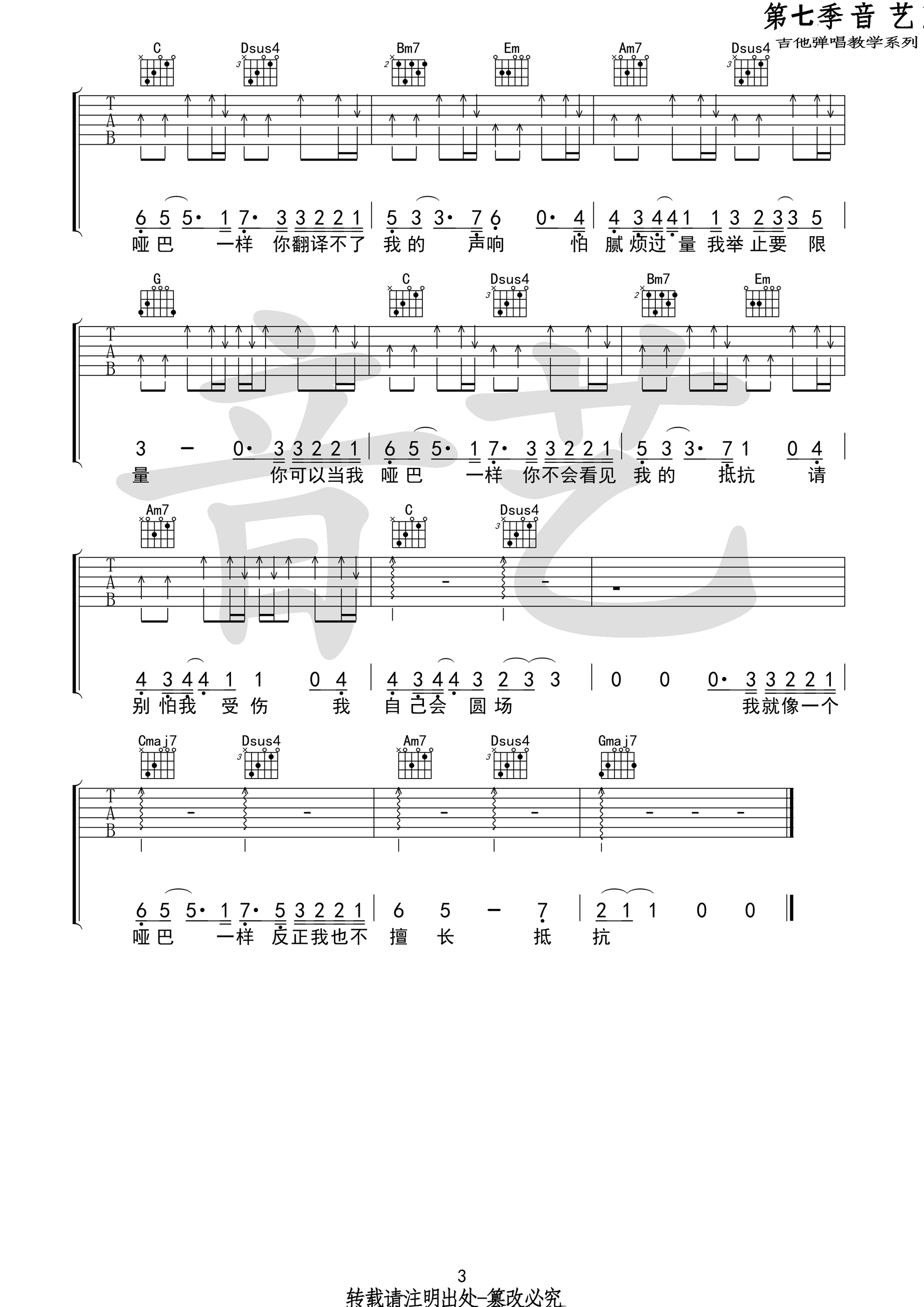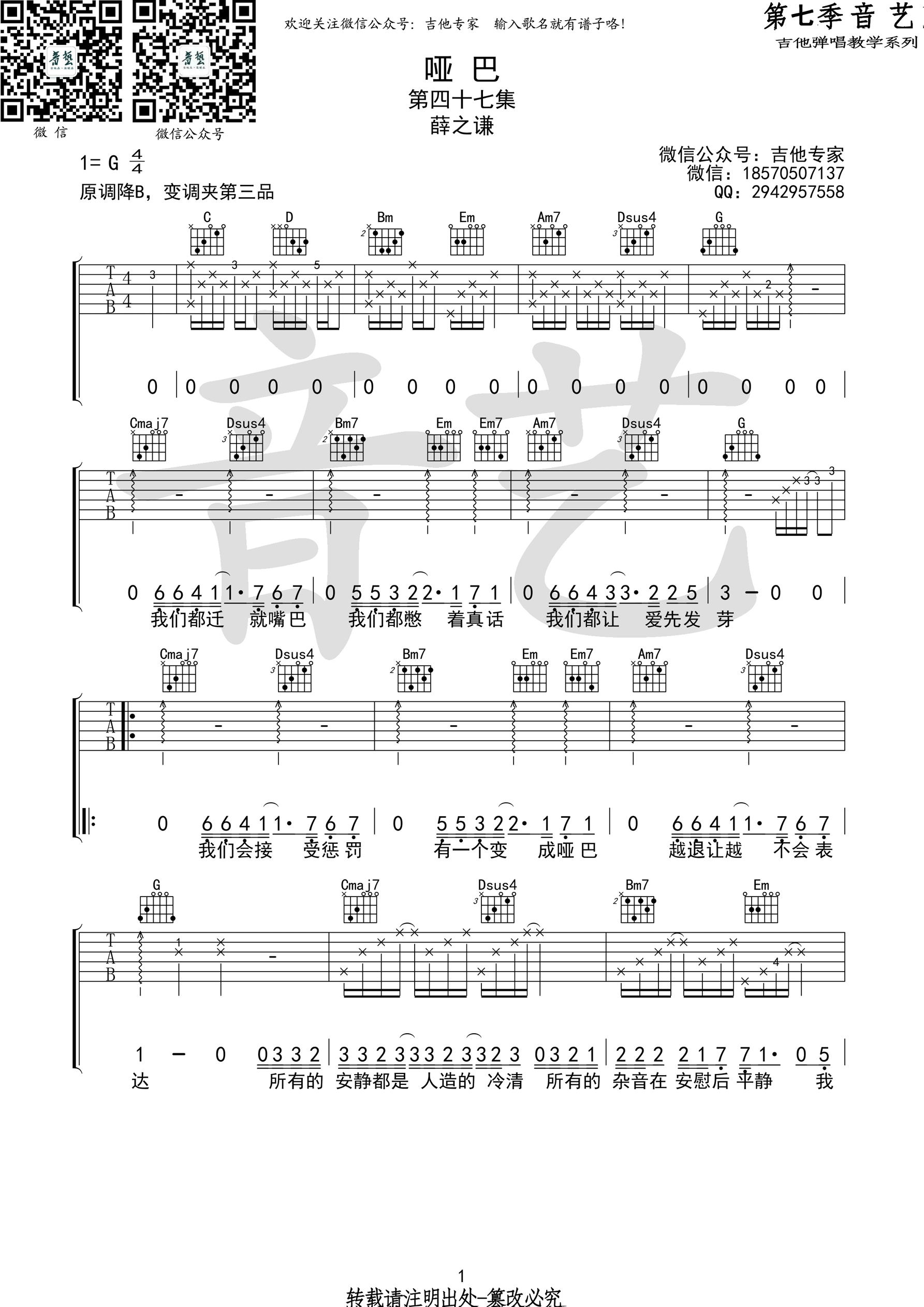 曲谱介绍: 薛之谦《哑巴》吉他弹唱谱,采用G调指法编配,共有3张高清图谱。