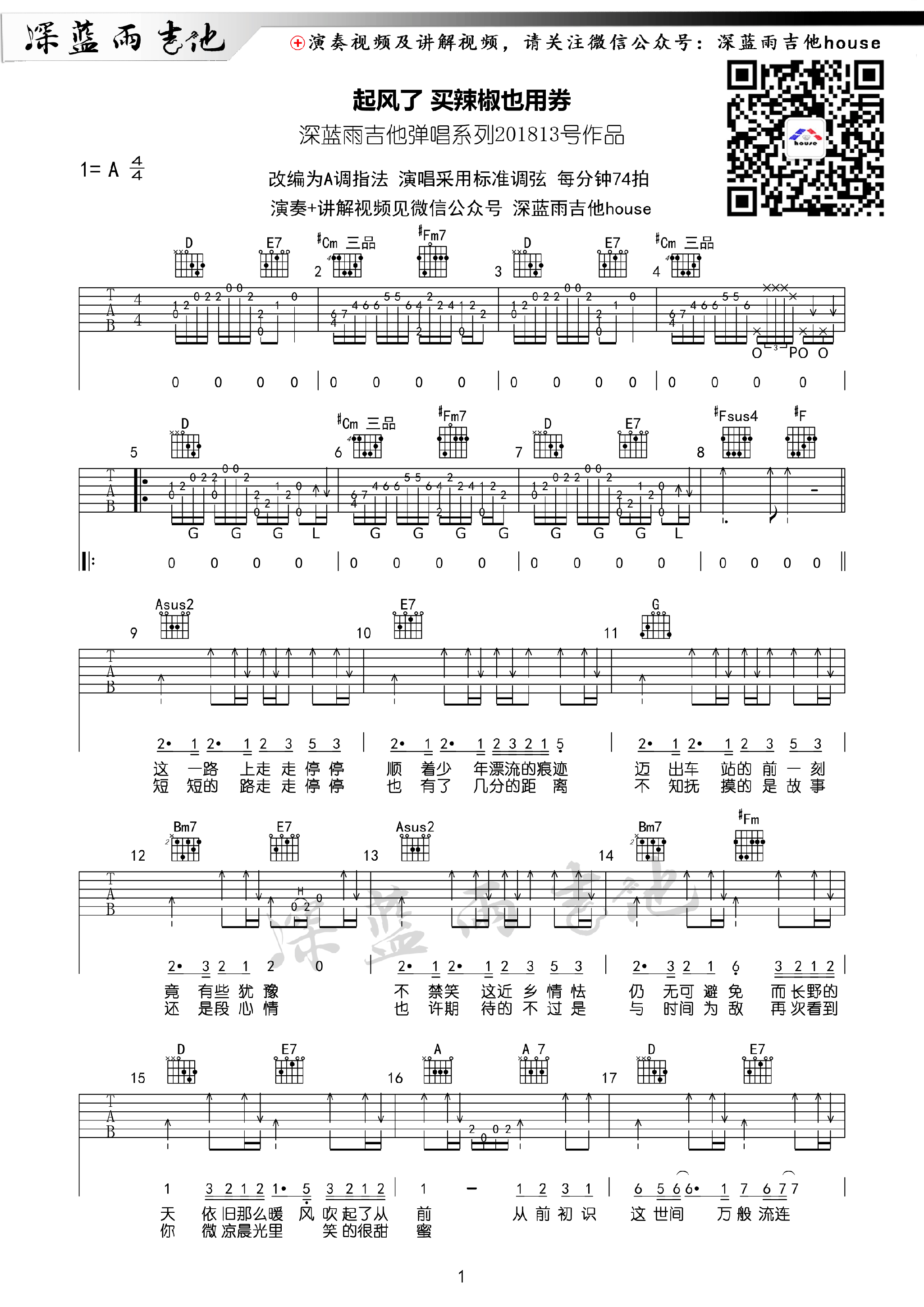 曲谱介绍: 买辣椒也用券《起风了》吉他弹唱谱,采用A调指法编配,共有3张高清图谱。