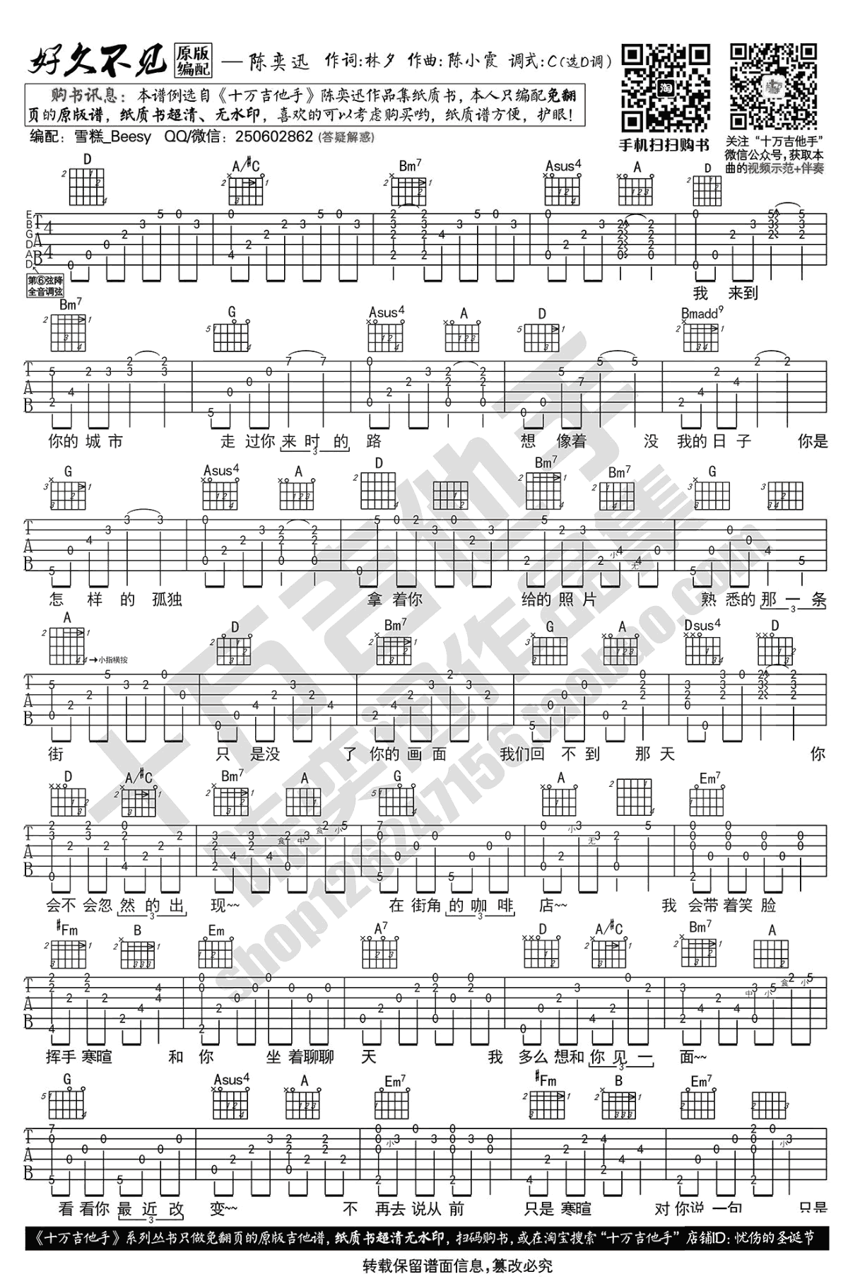 曲谱介绍: 陈奕迅《好久不见》吉他弹唱谱,采用D调指法编配,共有2张高清图谱,免翻页排版设计。