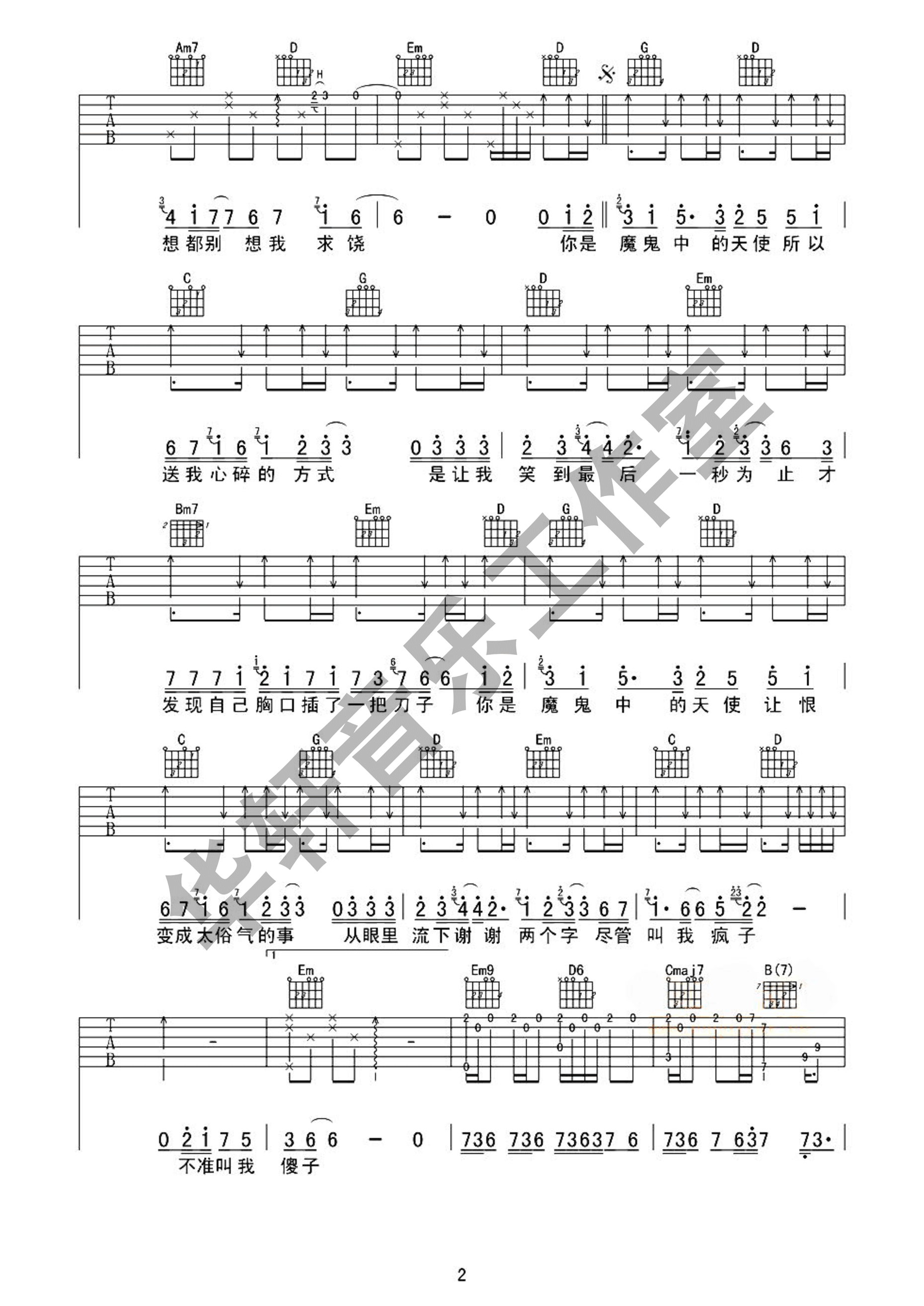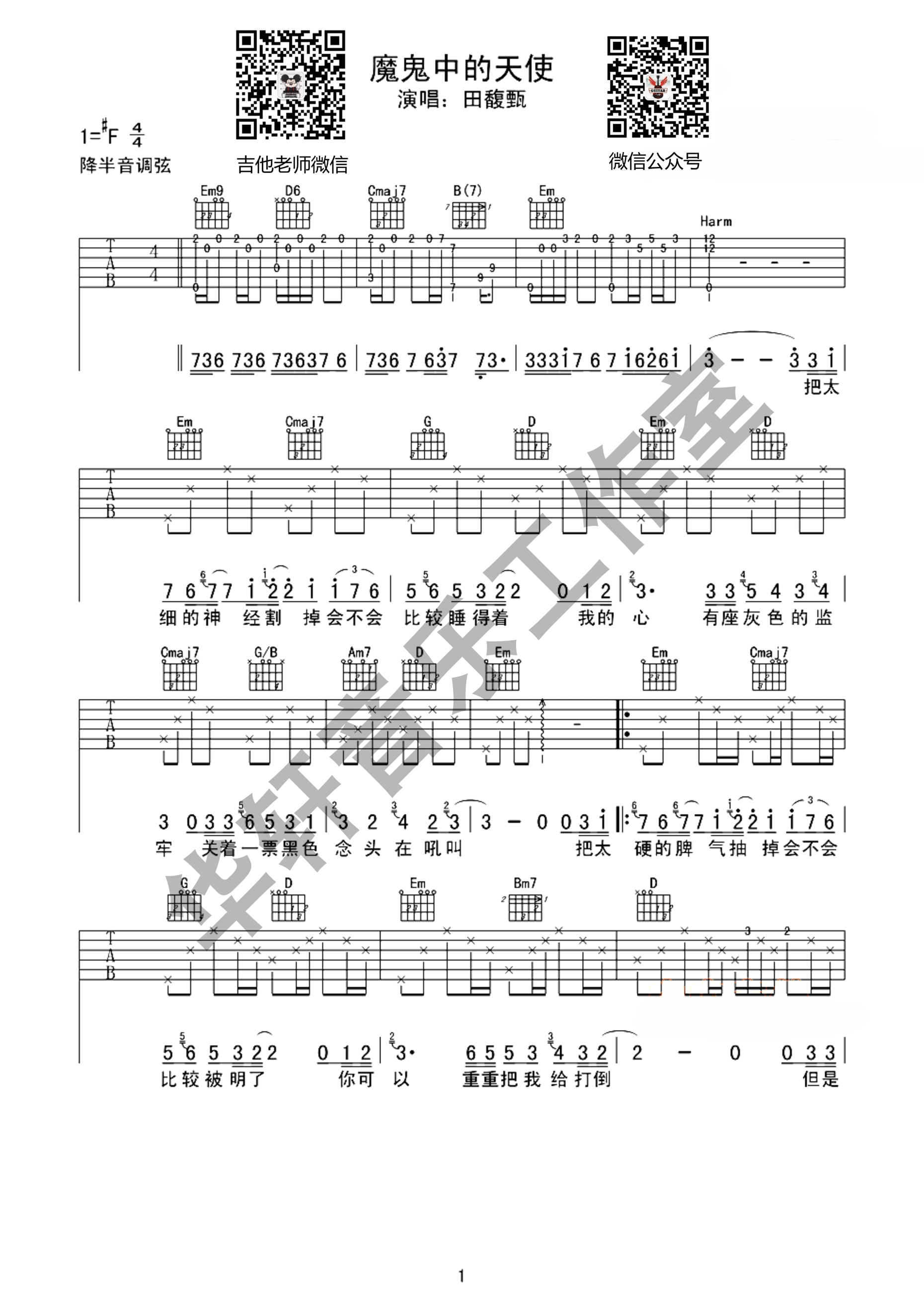 曲谱介绍: 田馥甄《魔鬼中的天使》吉他弹唱谱,采用F调指法编配,共有3张高清图谱。