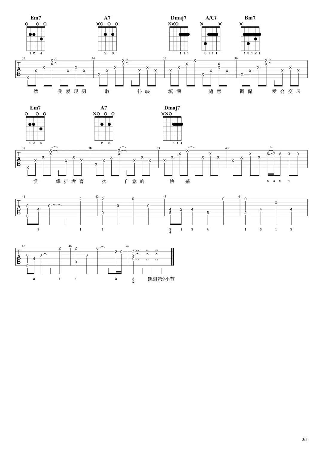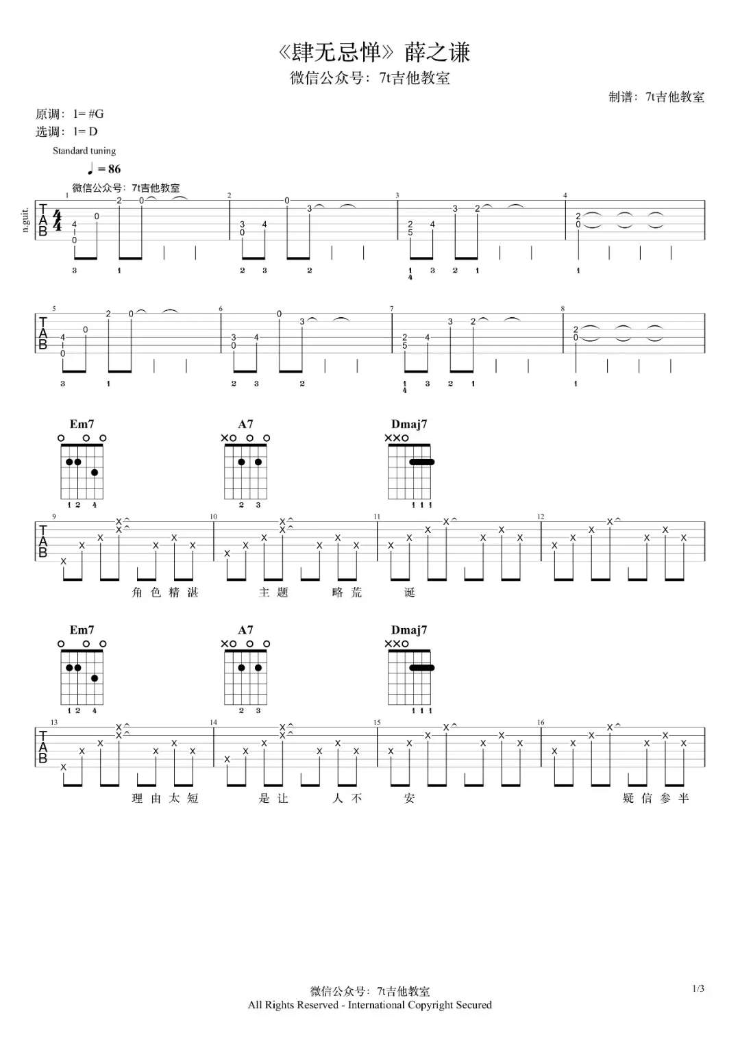 曲谱介绍: 薛之谦《肆无忌惮》吉他弹唱谱,采用D调指法编配,共有3张高清图谱。