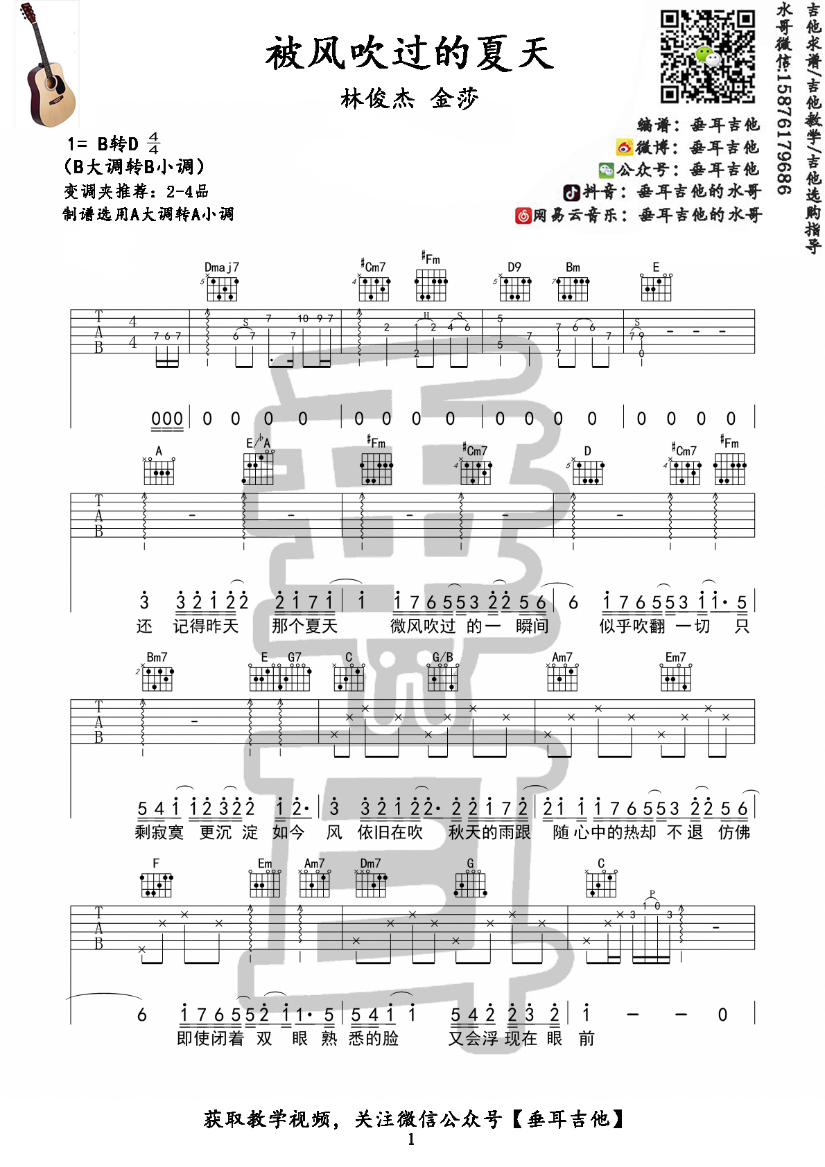 曲谱介绍: 林俊杰,金沙《被风吹过的夏天》吉他弹唱谱,采用D调指法编配,共有3张高清图谱。