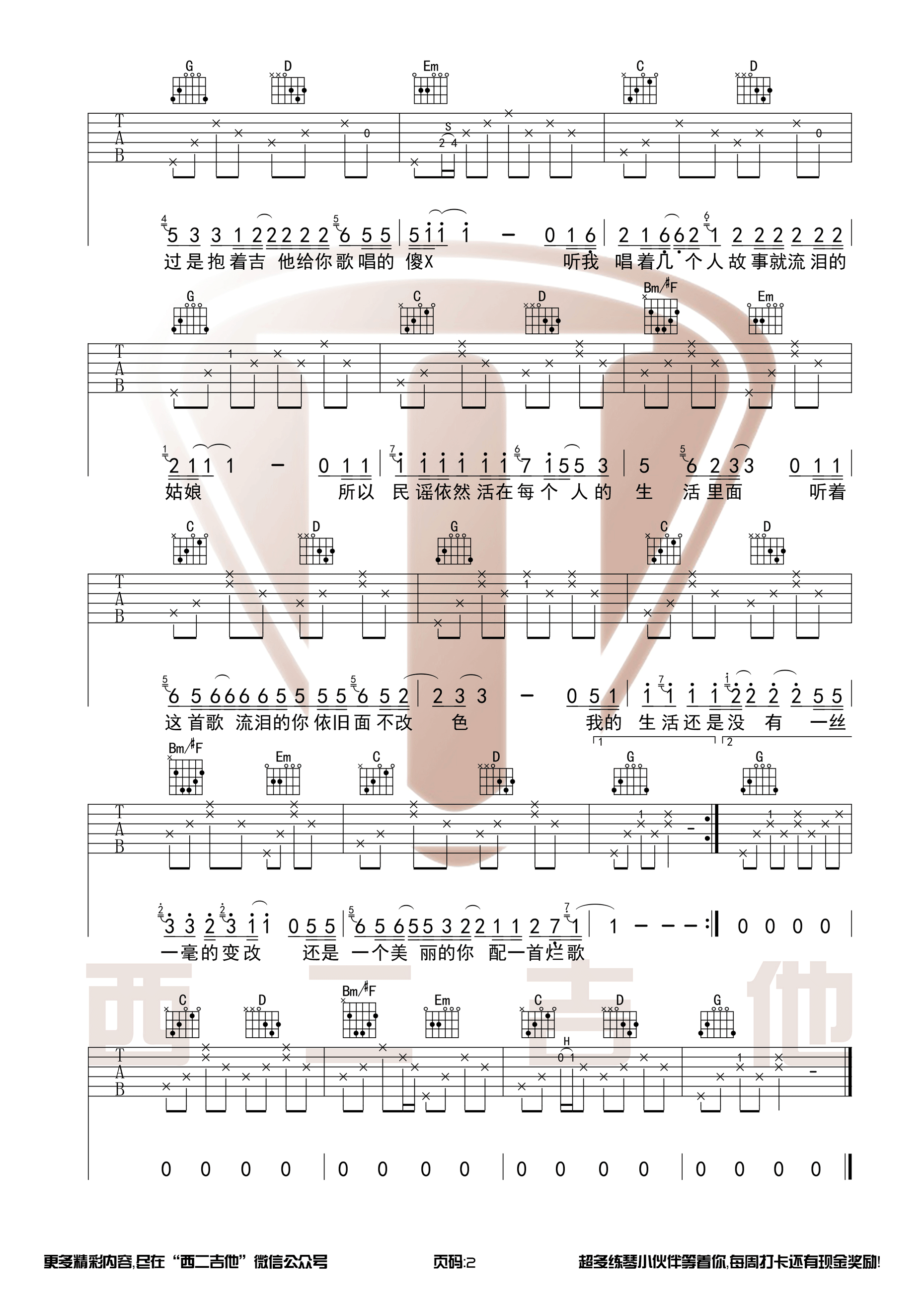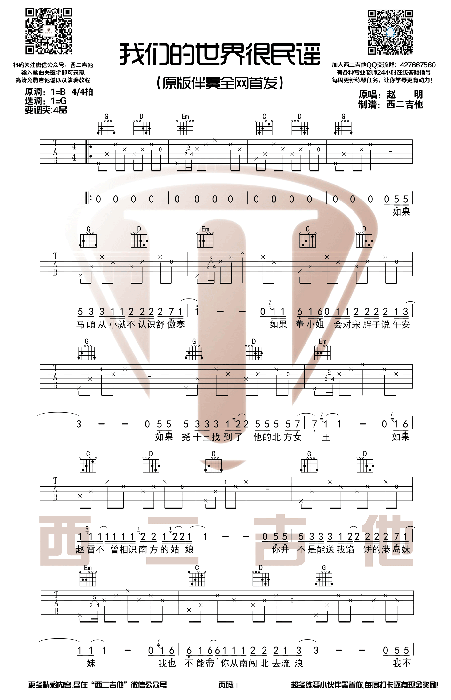 曲谱介绍: 赵明《我们的世界很民谣》吉他弹唱谱,采用G调指法编配,共有2张高清图谱,免翻页排版设计。
