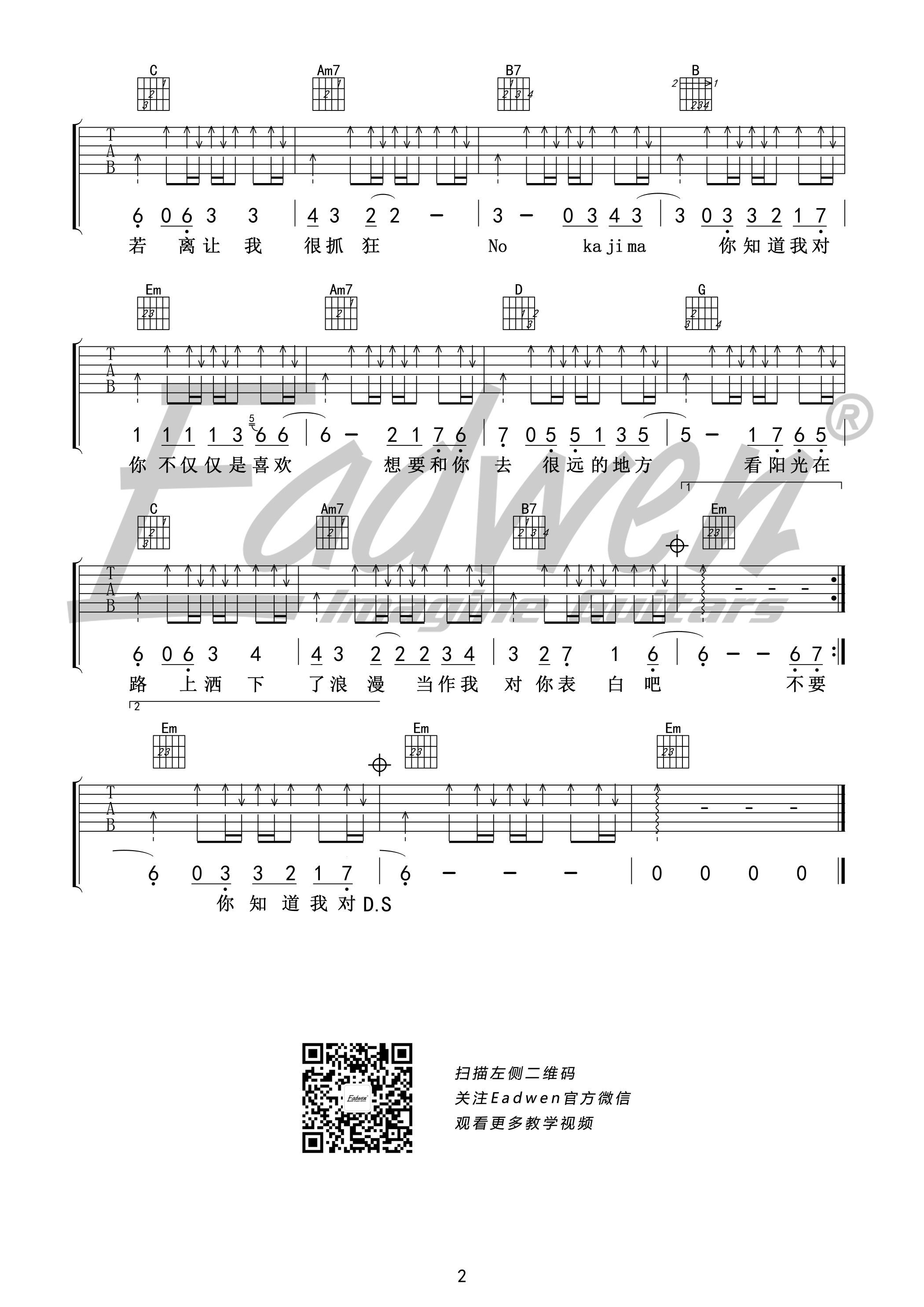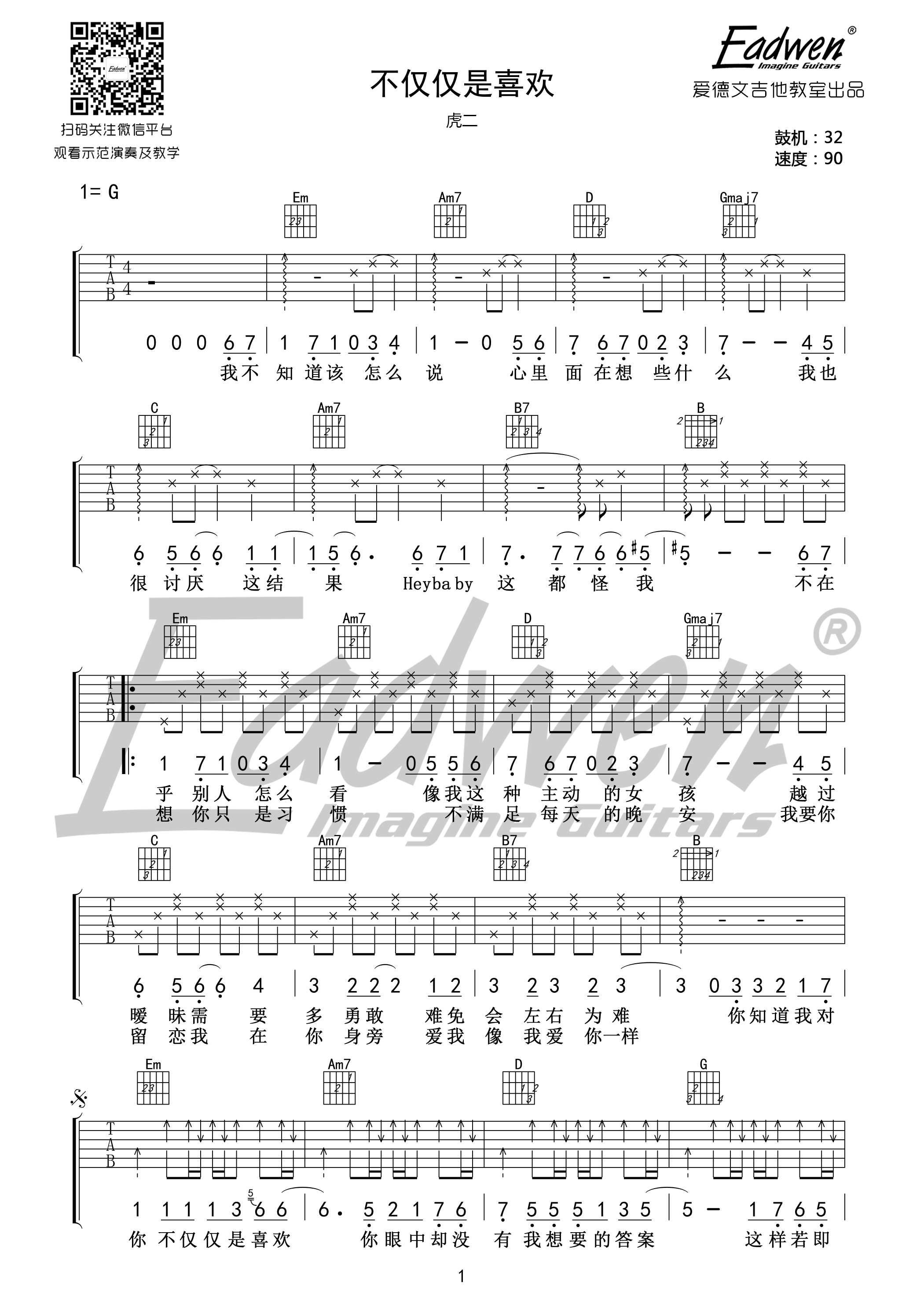曲谱介绍: 虎二《不仅仅是喜欢》吉他弹唱谱,采用G调指法编配,共有2张高清图谱,免翻页排版设计。